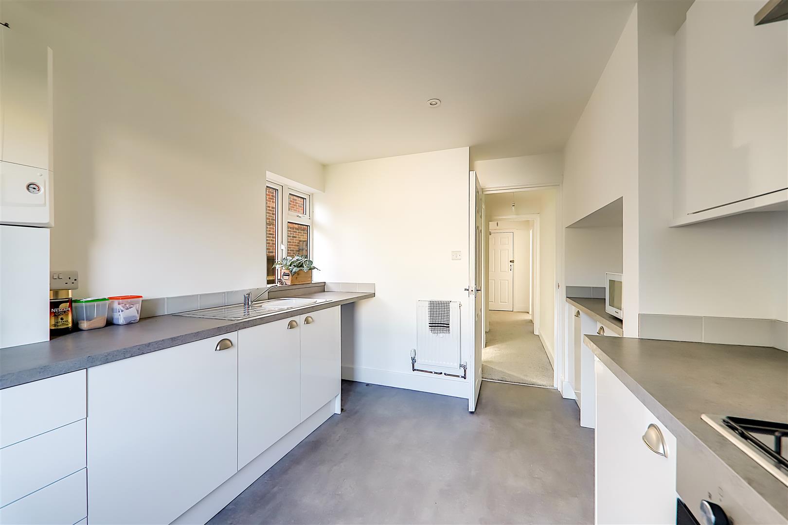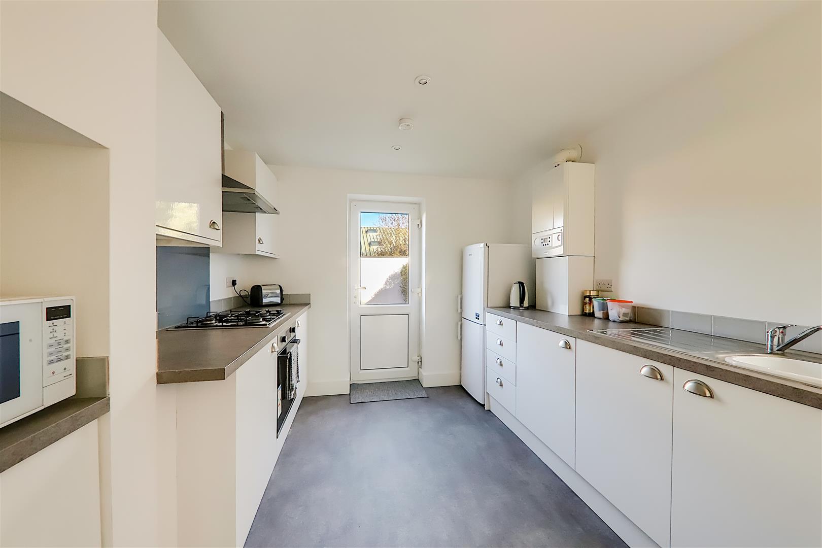 Fitted suite comprising of a single drainer sink unit with mixer taps and storage cupboards below. Areas of roll top work surfaces offering additional cupboards and drawers under. Matching shelved wall units. Four ring hob with extractor hood over and fitted oven and grill below. Space for washing machine, upright fridge/freezer and further appliance. Wall mounted central heating boiler. Radiator. Levelled ceiling with spotlights. South aspect double glazed window. Double glazed door to rear garden.