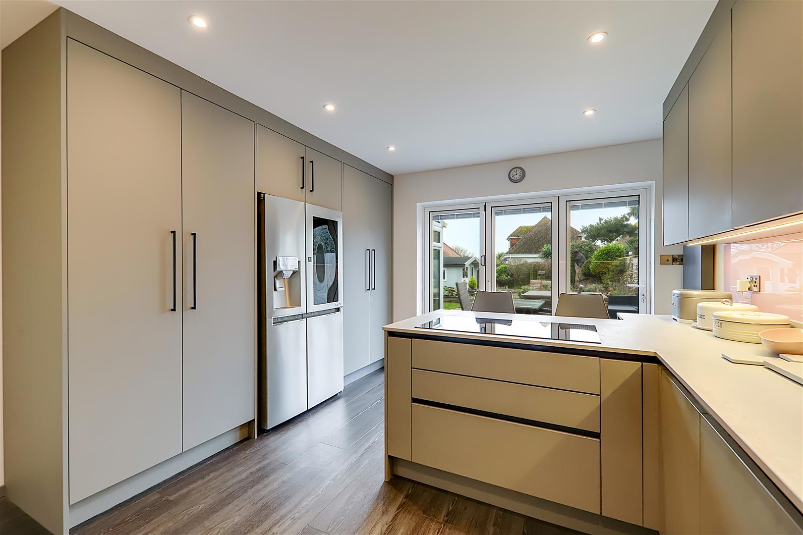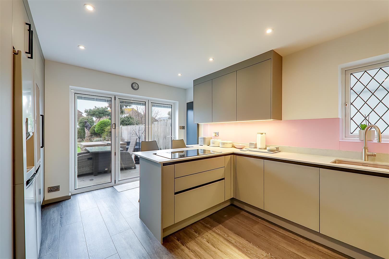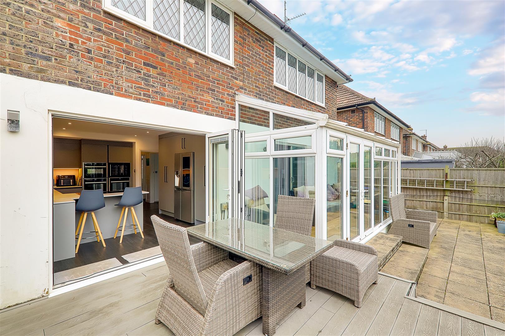 We are delighted to offer this beautifully presented detached home, ideally located just moments from Goring-by-Sea beach. The accommodation is arranged over two floors and briefly comprises three versatile reception rooms, including a dining room, lounge, and conservatory. At the heart of the home is a stunning refitted Alexanders kitchen, featuring bi-fold doors that open directly onto the rear garden perfect for modern family living and entertaining. Upstairs, the property offers four generously sized bedrooms, including a master bedroom with a contemporary en-suite, along with a stylish additional family bathroom. Externally, the home benefits from a private driveway providing parking for multiple vehicles, along with access to a double-length garage via an up-and-over door. To the rear is a well-maintained west-facing garden, complete with a raised decking area, multiple patio spaces, and a detached outbuilding with an additional storage shed.