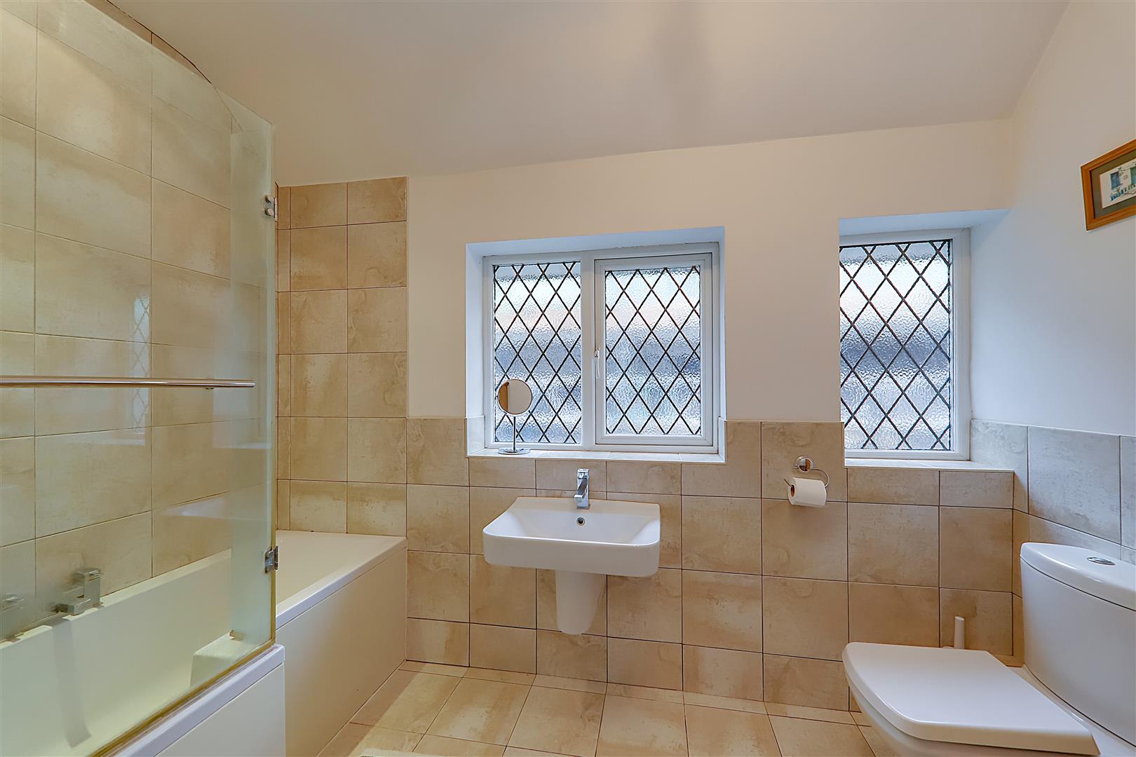 Tiled flooring throughout. Part tiled walls. Two frosted double glazed windows. Panelled bath with shower attachment above. Wall mounted sink with matching low level Wc. Wall mounted heated towel rail. Spotlights.