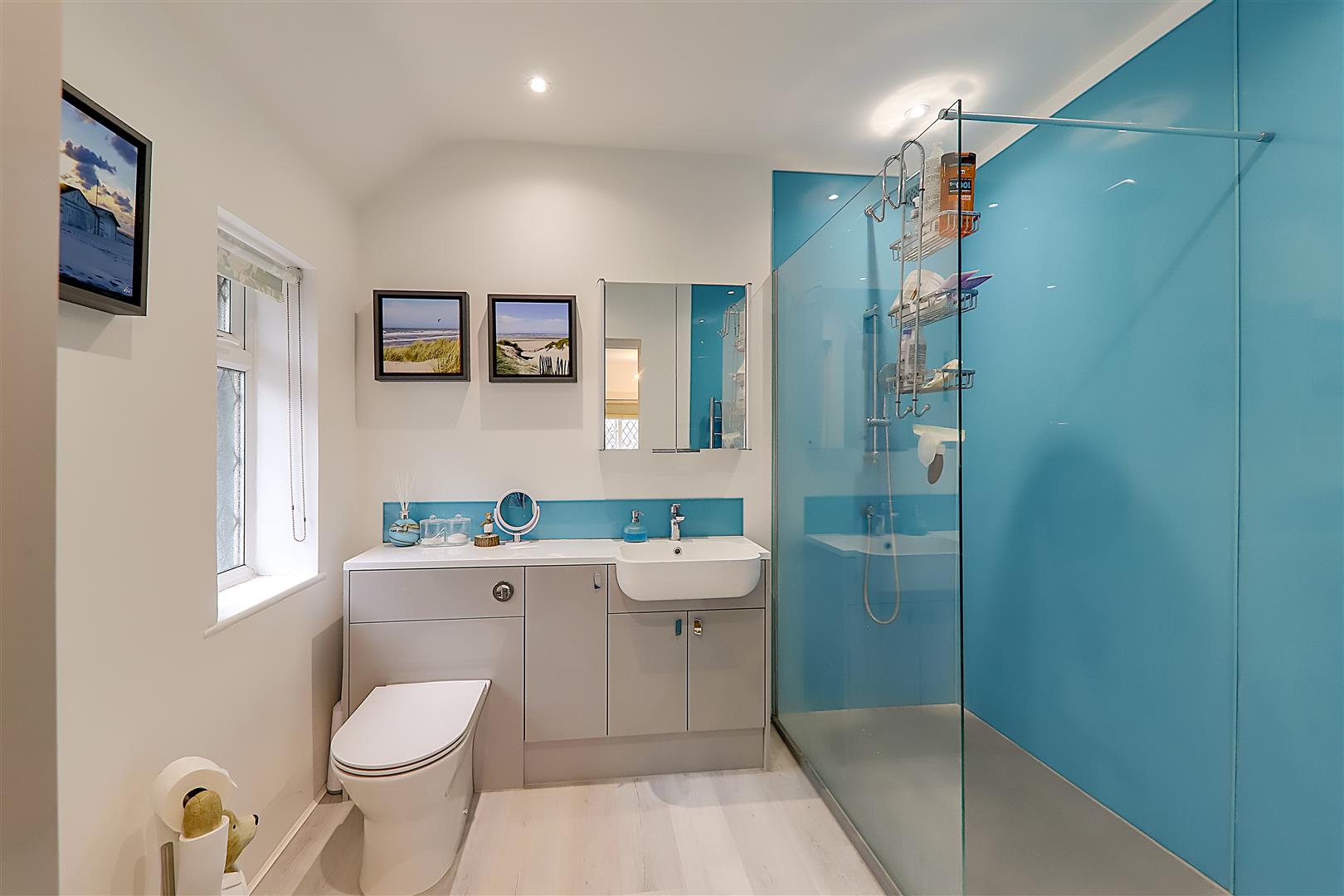 Floorboards throughout. Inset vanity sink unit with enclosed Wc. Frosted double glazed window. Wall mounted heated towel rail. Walk in shower with waterfall shower head. Spotlights.