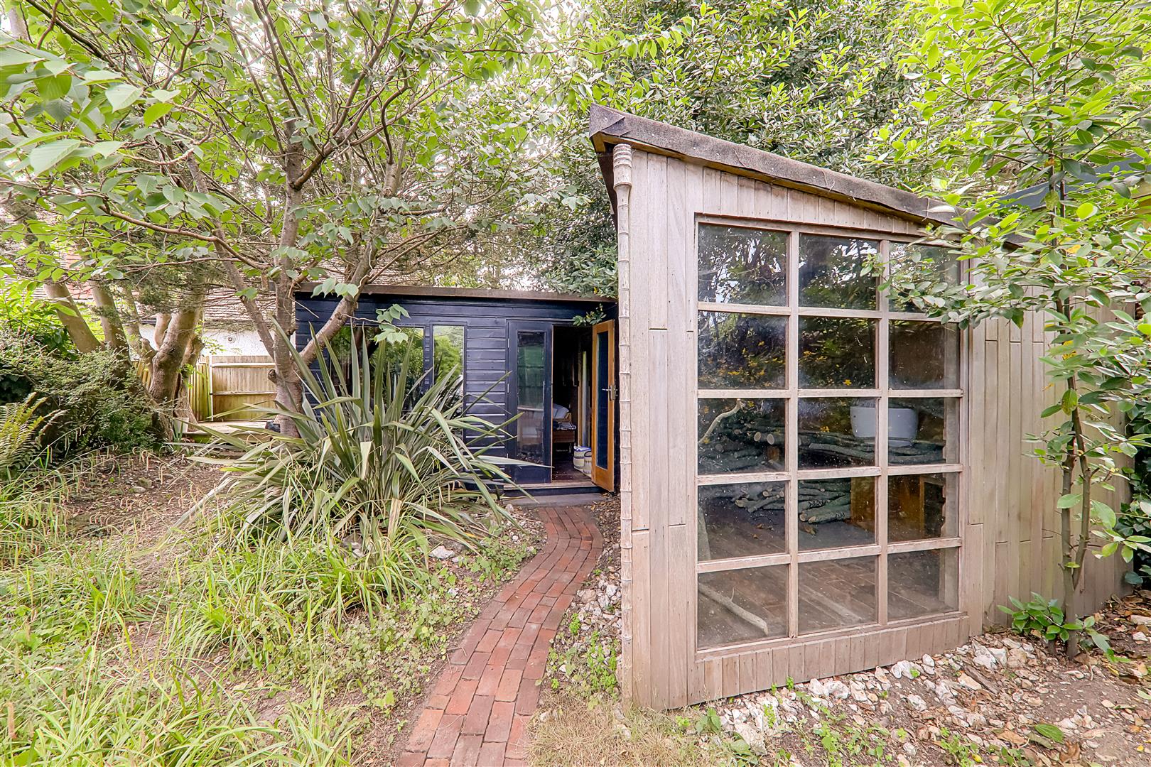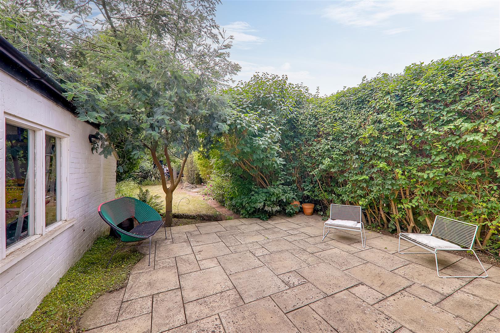 Patio area stepping onto large lawned area having various mature shrub, tree & plant borders, timber built storage shed, various vegetable planters.