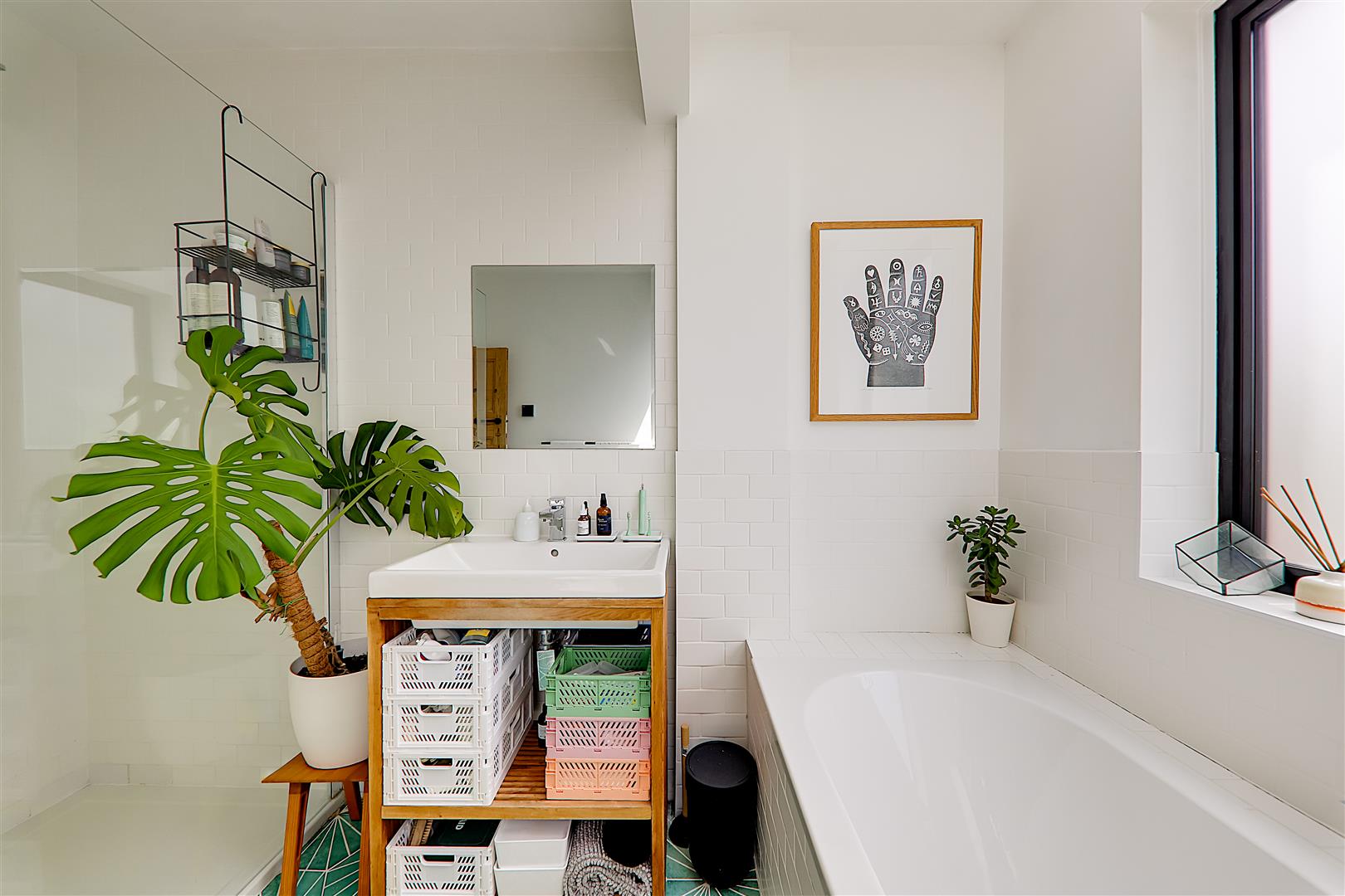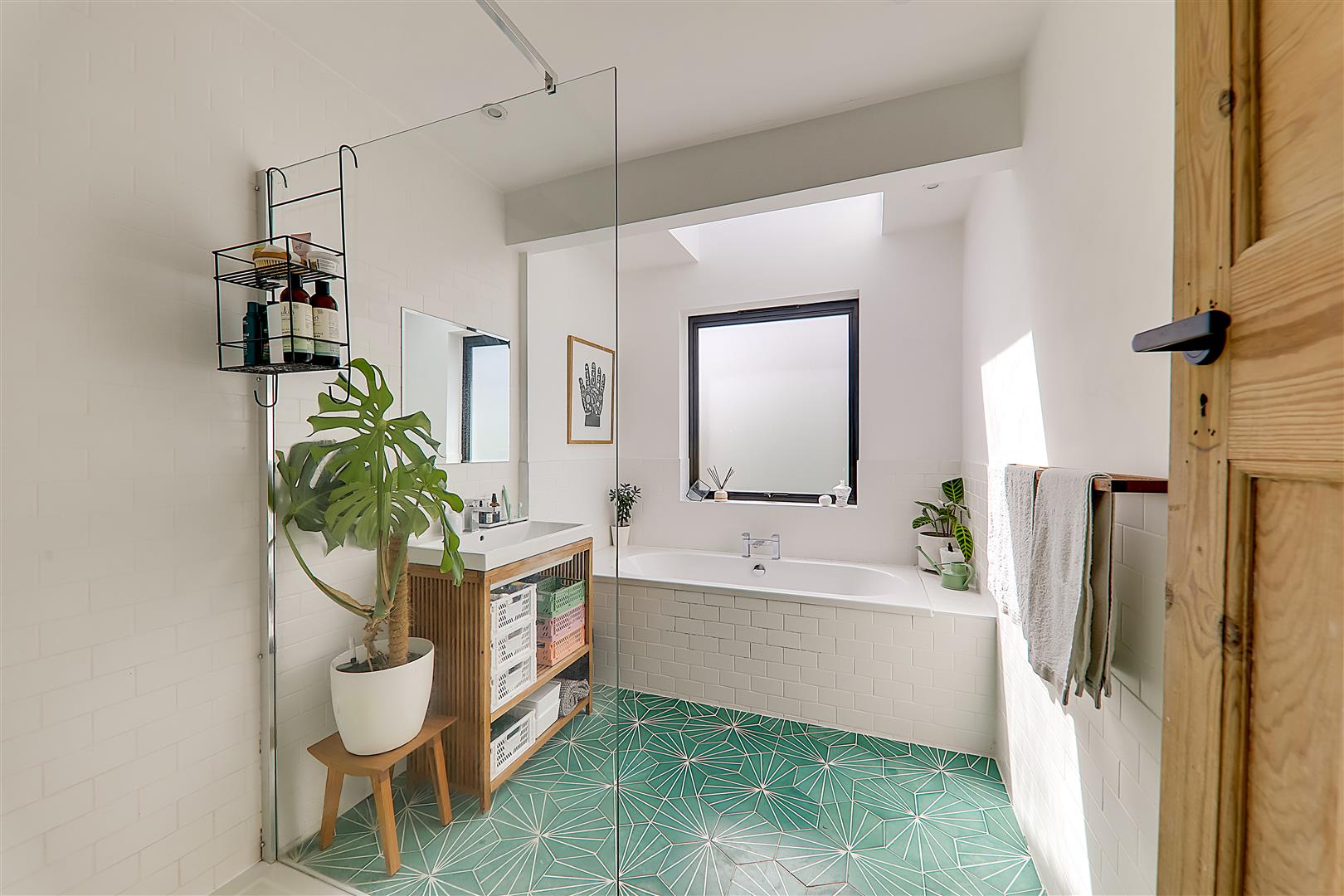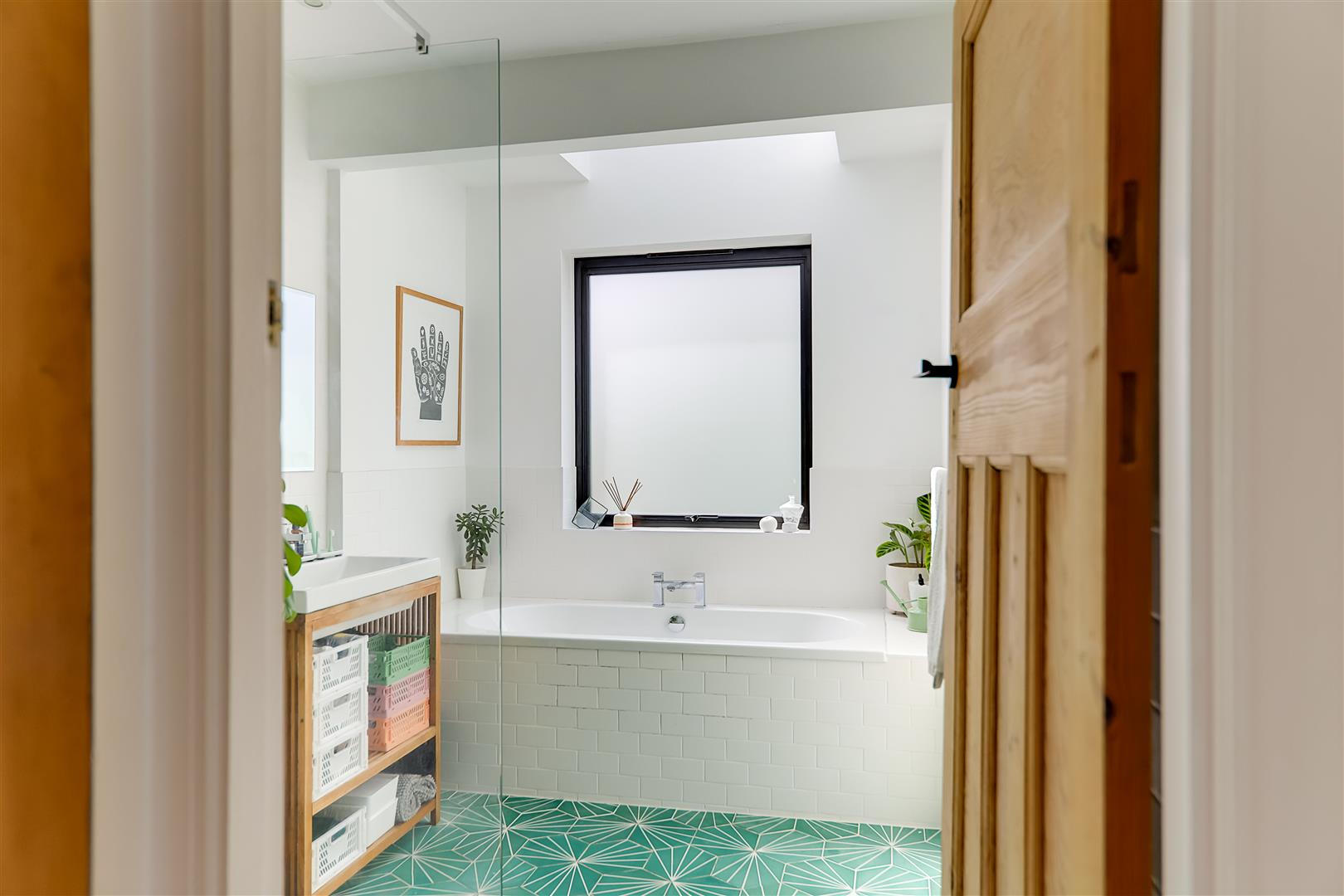 Tiled flooring, panel enclosed bath with mixer tap, contemporary hand wash basin with mixer tap, separate shower cubicle having at integrated shower being fully tiled, part tiled walls, double glazed window, opening skylight with automatic rain detection, skimmed ceiling with spotlights.