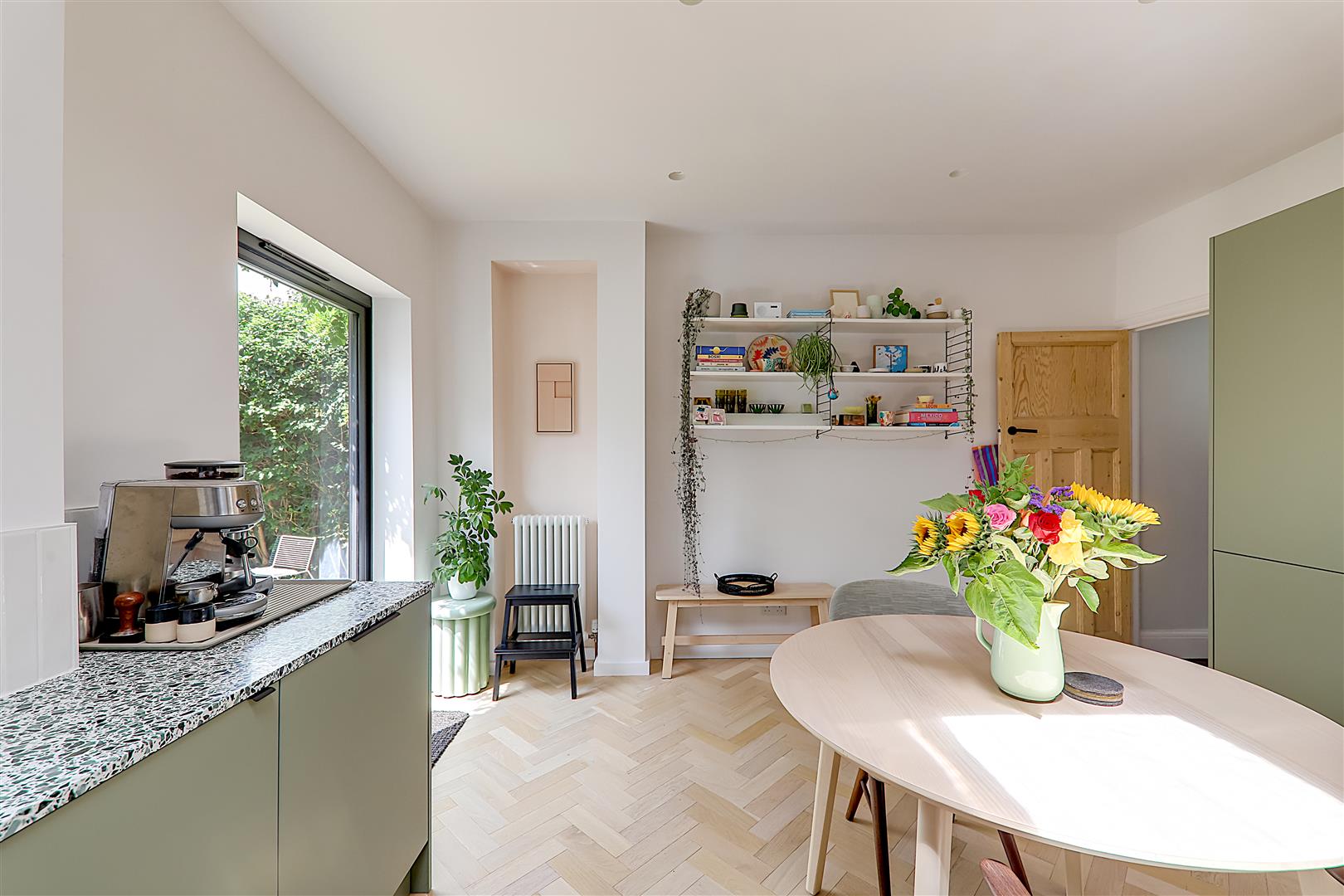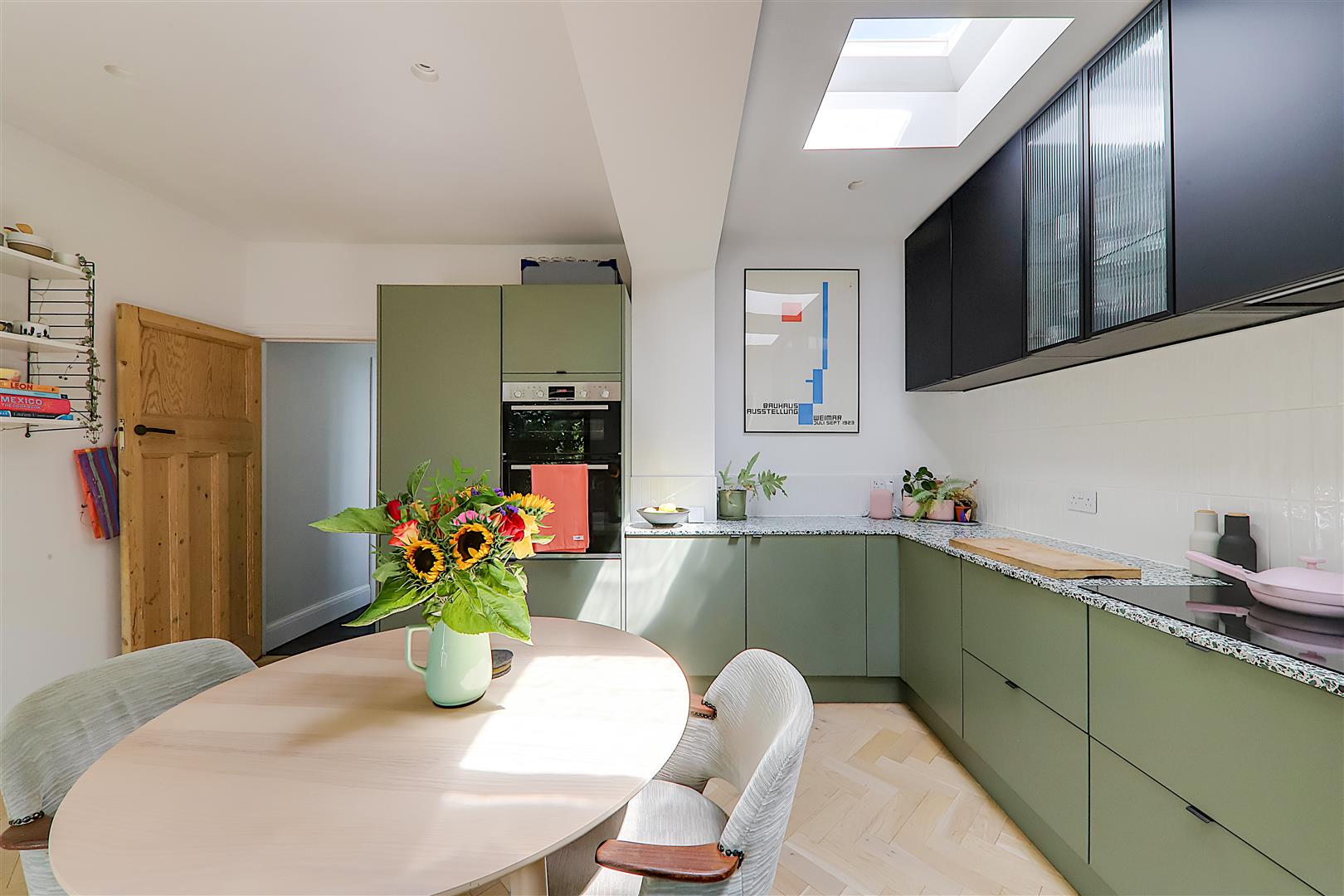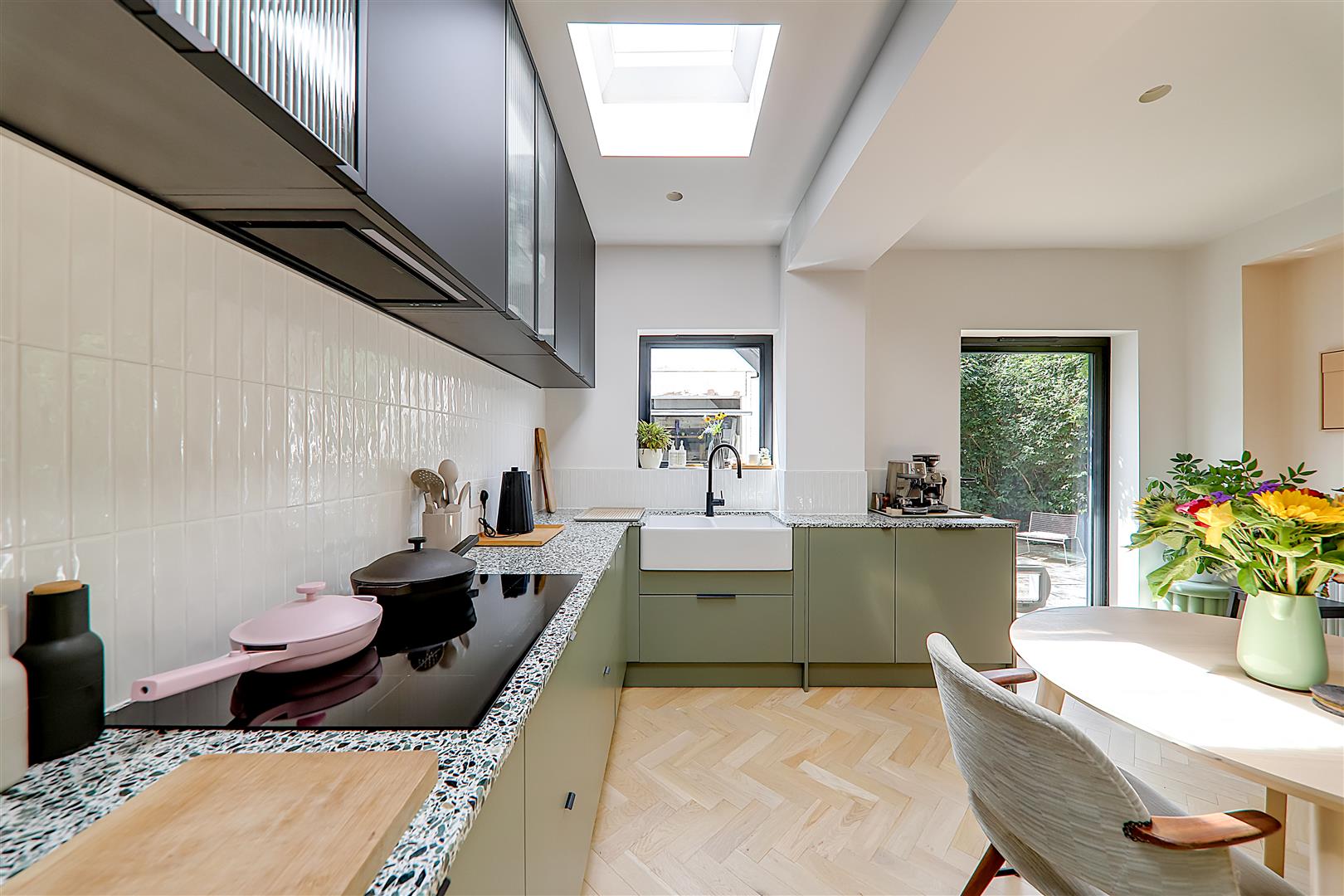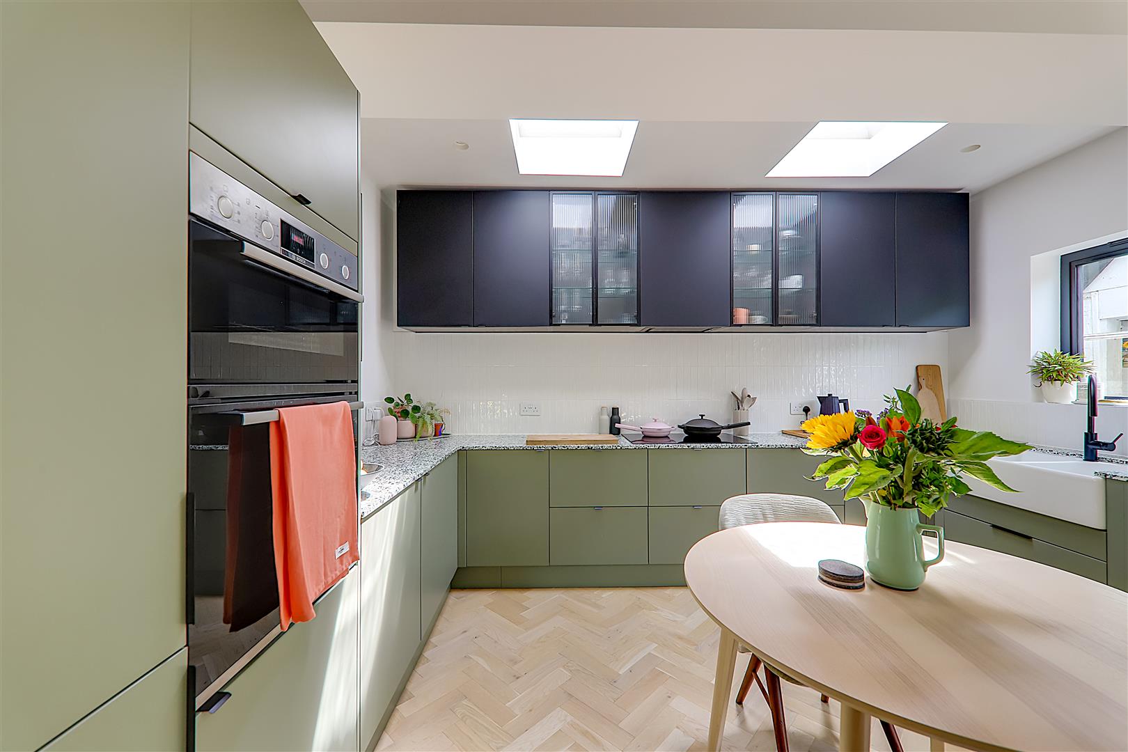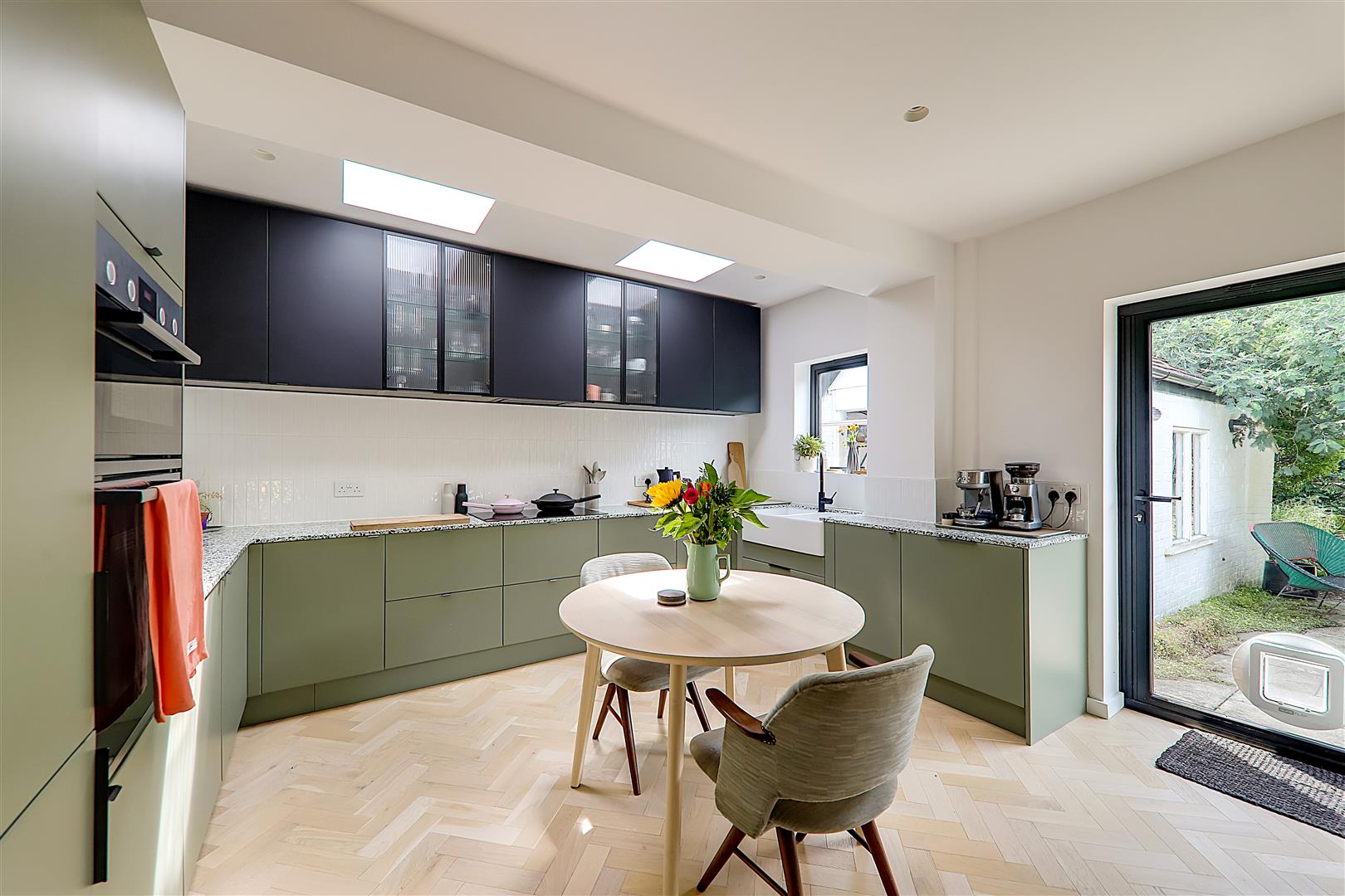 Solid wooden floor, double glazed door to rear garden, solid Diespeker Terrazzo worksurfaces with cupboards below & matching eye level cupboards with a Matt finish, inset two bowl sink unit with mixer tap, matching integrated fridge freezer & dishwasher, fitted eye level double oven, integrated induction hob with extractor fan over, two skylight windows, skimmed ceiling with spotlights.