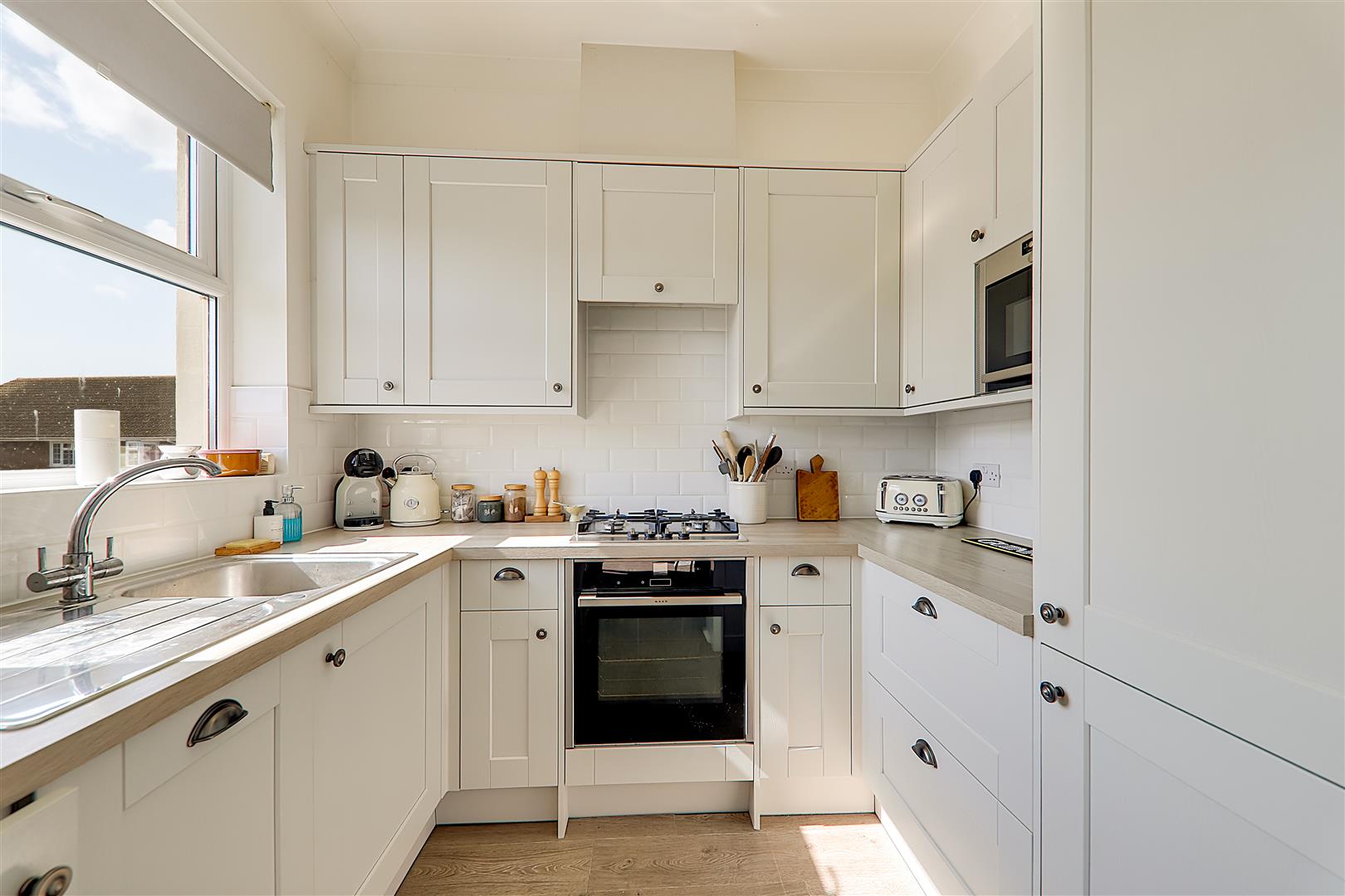 Square edge work surface having inset single bowl stainless steel stink with mixer tap and draining board. Four ring gas hob with concealed extract fan above. Fitted fan oven. Integrated appliances, including slimline dishwasher, fridge/freezer and microwave. Matching range of cupboards, drawers and eye level wall units. Tiled splash back surround. Pull out bin storage. Double glazed window.