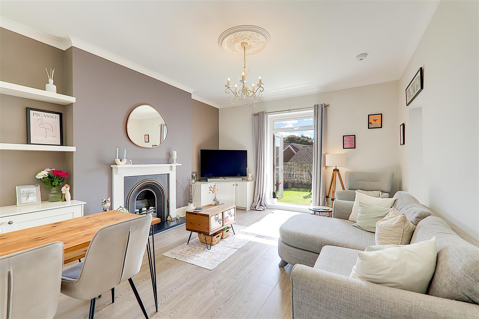 Bespoke and fitted storage cabinets with shelving. Levelled and coved ceiling with feature ceiling rose. Radiator. Feature cast iron fireplace with mantle surround. Double glazed French doors leading to: