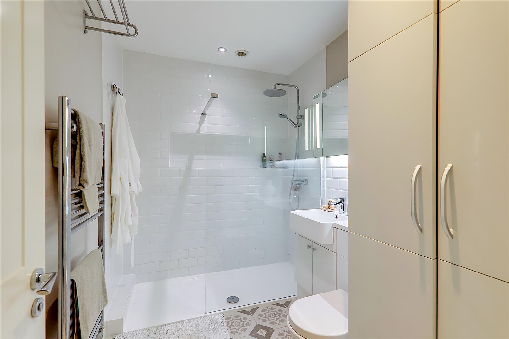 White suite comprising: walk in shower tray with glazed screen and overhead rainfall shower with wall mounted controls and separate handheld attachment. Vanity unit comprising wash handbasin with mixer tap, cupboard space below, and concealed cistern WC. Ladder style towel radiator. LED mirrored cabinet. Tiled floor. Built in laundry cupboard with work surface and space and plumbing for washing machine below. Extractor fan. Part tiled walls. Inset ceiling spotlighting.