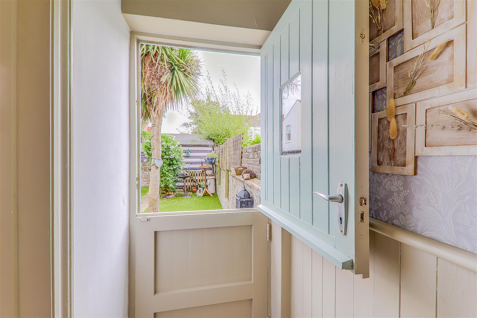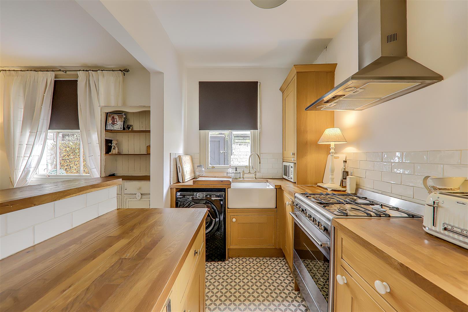 A fitted suite comprising of a butler sink with mixer taps and storage below. Areas of wooden work surfaces with additional cupboard and drawers below. Matching shelved wall units. Integrated fridge. Space for freestanding washing machine and single gas oven. Fitted extractor hood over. Wall mounted boiler housed by cupboard. Sash glazed window. Panelled walls. Tiled flooring. Access to rear garden via wooden stable door. Levelled ceiling.