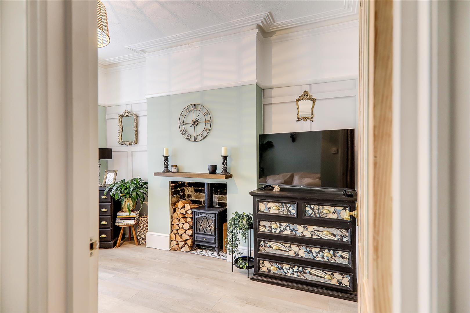 West aspect via double glazed bay window. Radiator. Open fire place. Picture rail. Glazed internal window. Coved and textured ceiling.