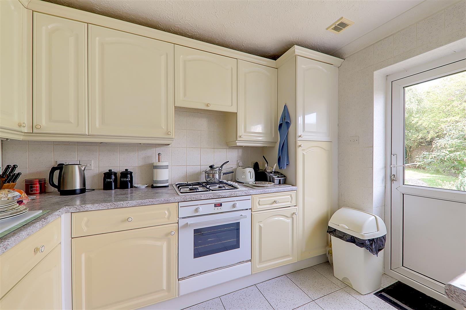 Fully tiled. Comprising of rolled top work surfaces with single drainer sink unit with mixer taps. Range of base units comprising of cupboards and drawers. Matching eye level wall units with concealed lighting under. Fitted electric oven. Four ring gas hob with extractor over. Space and plumbing for washing machine. Space for fridge/freezer. Tiled floor. Double glazed window. Double glazed door to garden.