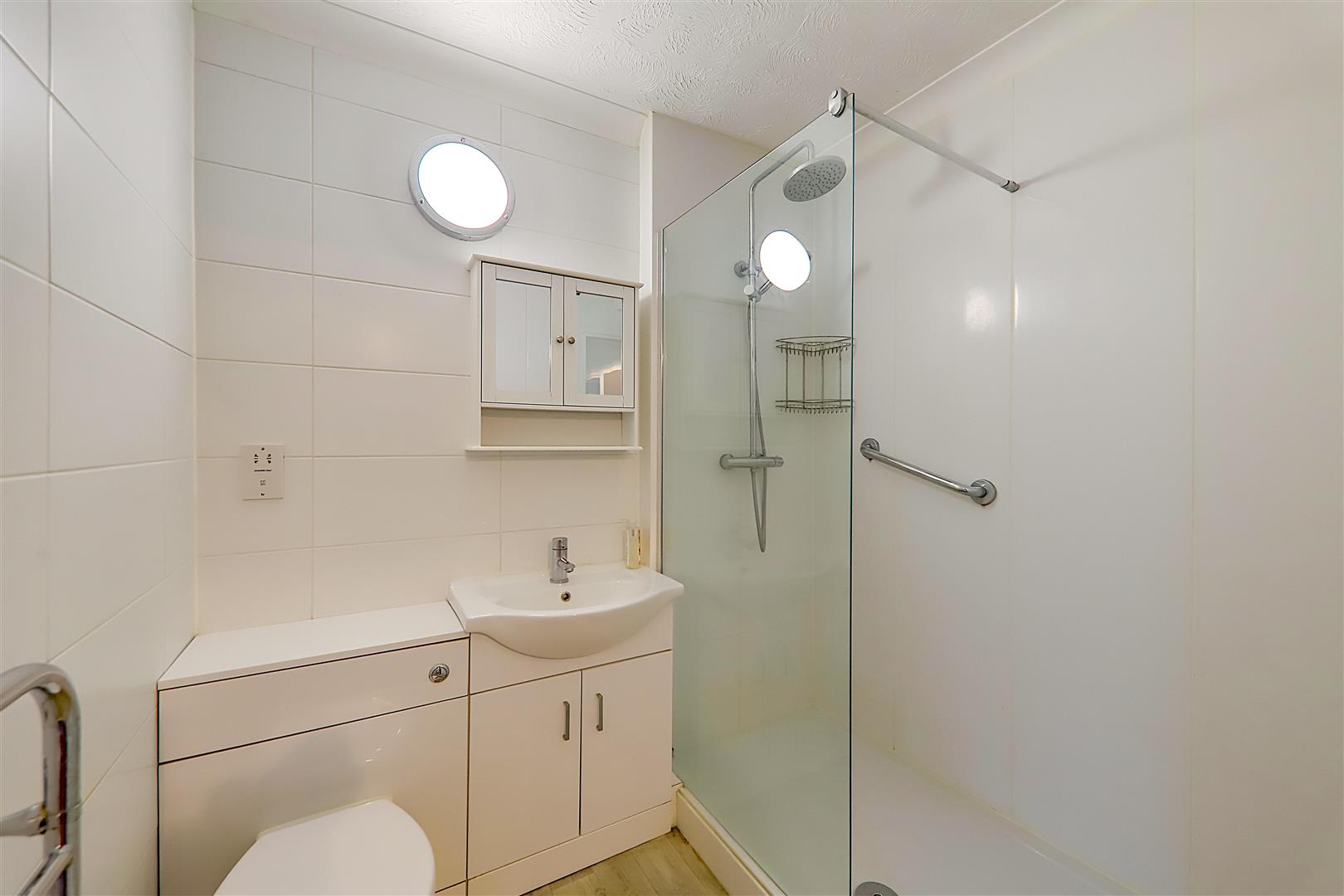 Vinyl flooring, low flush WC, hand wash basin with mixer tap having cupboards below, wall mounted vanity unit with mirrored front, fitted double width shower cubicle having an integrated power shower, extractor fan, wall mounted electric heater, textured ceiling with coving.
