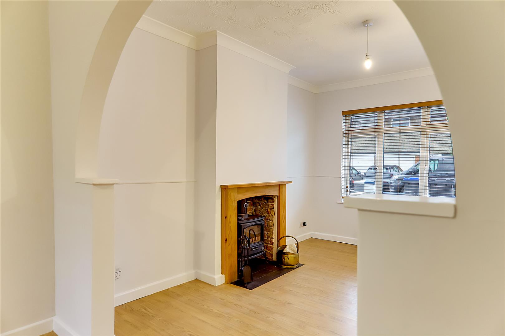 Textured ceiling with two pendant light fittings. South aspect double glazed window. Fitted cupboard housing utility meters. Fireplace with wood burner. Wood-effect laminate flooring. Open archway leading through to: