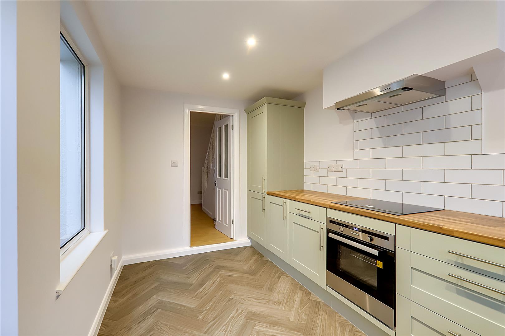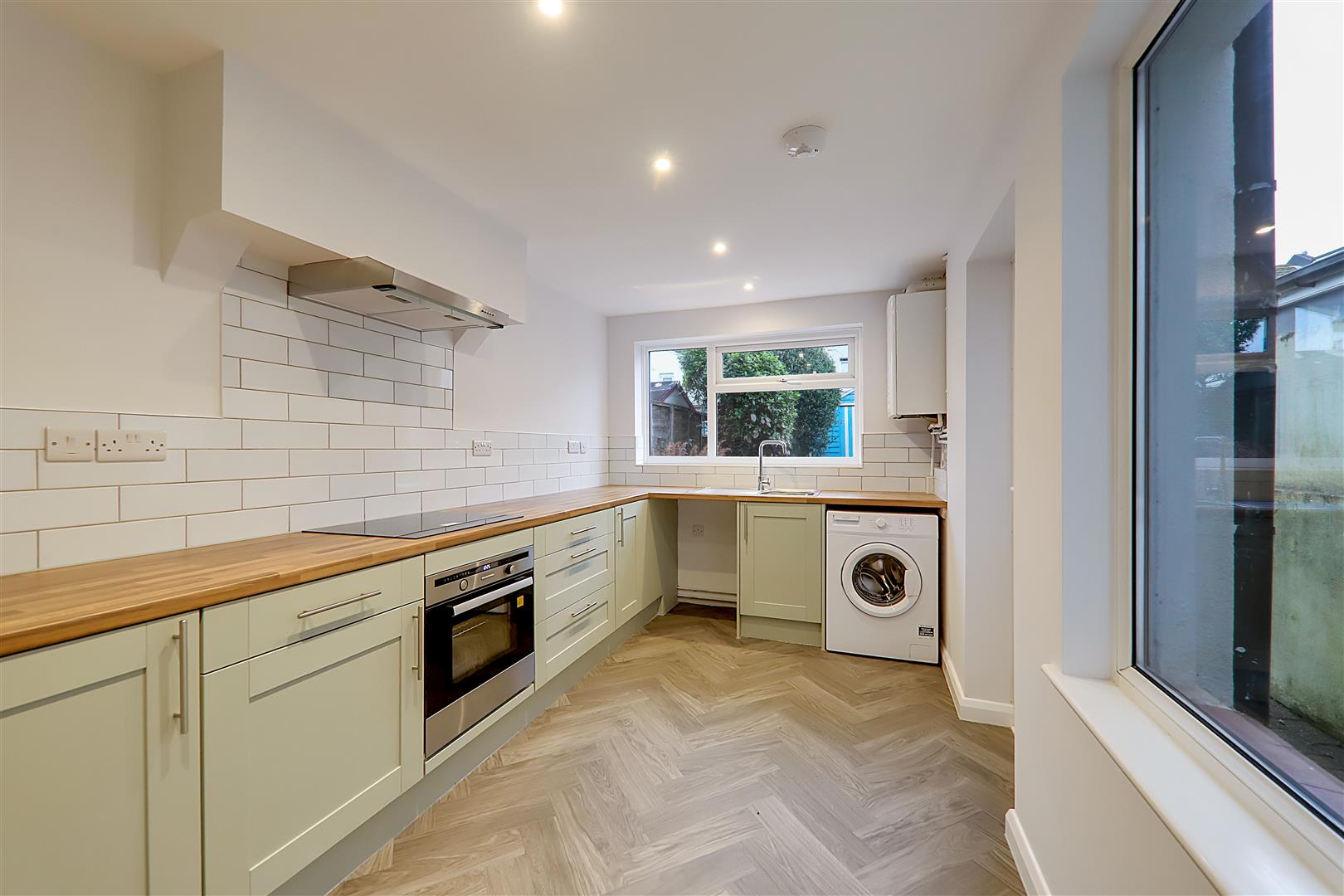 Level ceiling with spotlights. Roll top work surfaces and shaker-style kitchen units with a range of cupboards and drawers. Part-tiled splashback. Stainless steel single drainer sink unit with mixer tap. Fitted electric oven. Electric hob with extractor hood above. Space and plumbing for a dishwasher, freestanding washing machine, and space for upright fridge freezer. Wall-mounted boiler. North and east aspect windows. Herringbone-style vinyl flooring. Door providing access to the rear garden.