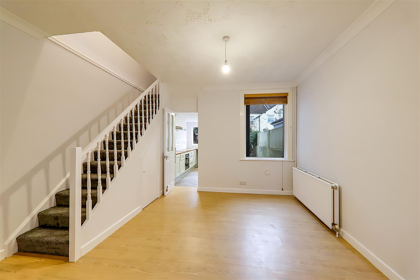 Textured ceiling with single pendant light. Stairs to the first floor with under-stair storage cupboard. North aspect double glazed window. Gas central heating radiator. Wood-effect laminate flooring. Door leading to: