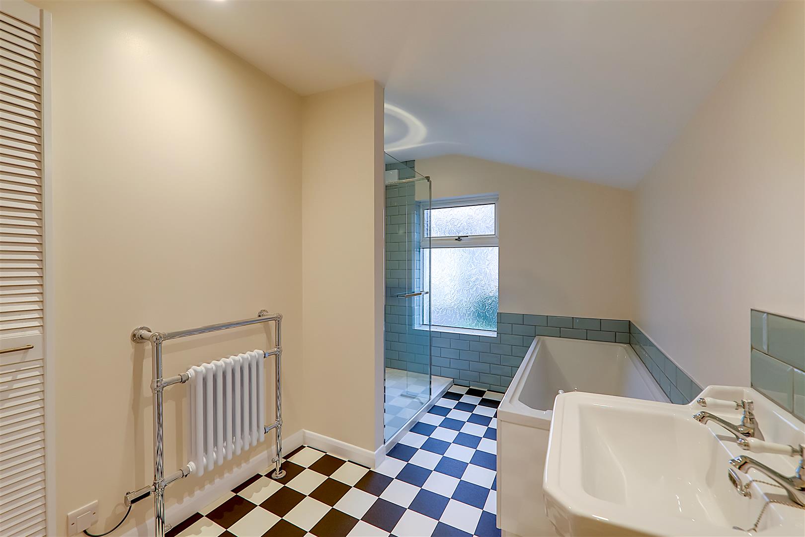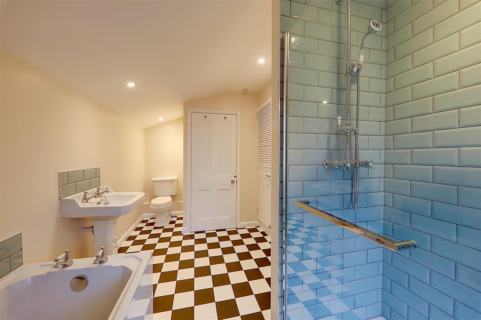 White suite comprising panel bath with Victorian style taps and low level tile surround. Separate walk in shower with tiled surround, glazed shower screen with wall mounted controls and rainfall shower over. Close coupled WC. Victorian style pedestal wash hand basin with matching taps. Electric towel radiator. Recessed shelved storage cupboard. Double glazed window.