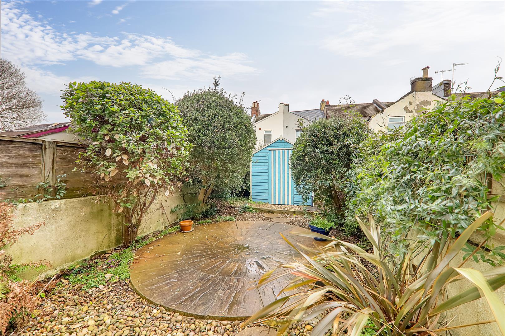 North-facing rear garden with walled boundaries. Combination of block-paved areas and shingle. Mature shrubs. Shed included.