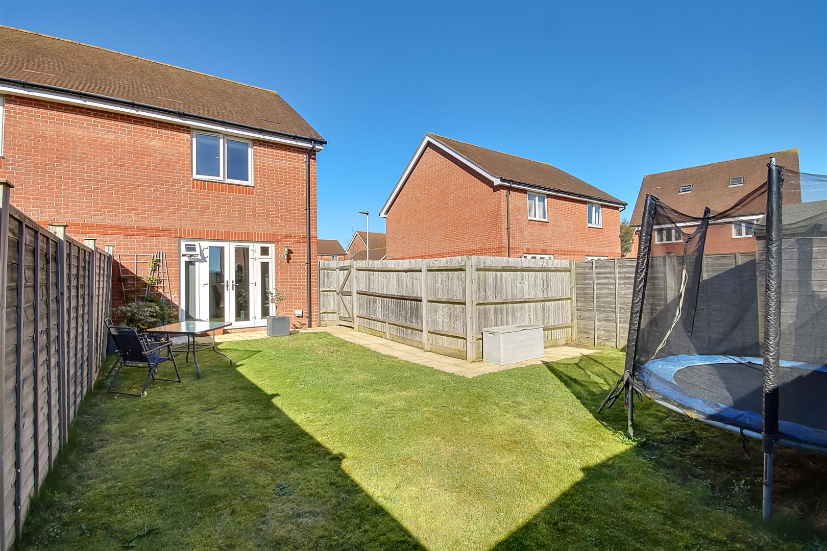 South facing, L 'shaped and a further feature of this home. The majority of area is laid to lawn and fence panel enclosed. Paved patio to rear of home. Side gate to parking spaces. Wooden storage shed.