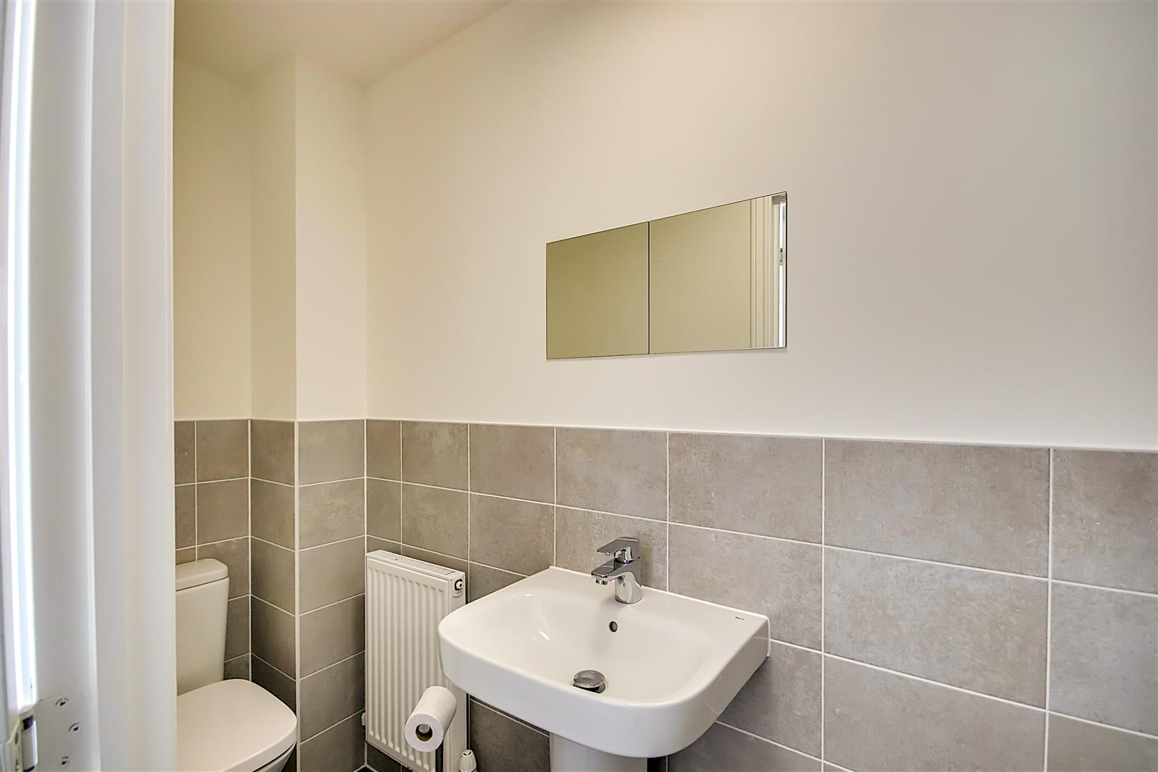 Push button w.c Pedestal wash hand basin with mixer taps and tiled splashback. Radiator. Wood effect LVT flooring. Levelled ceiling. Extractor fan. Obscure glass double glazed window.