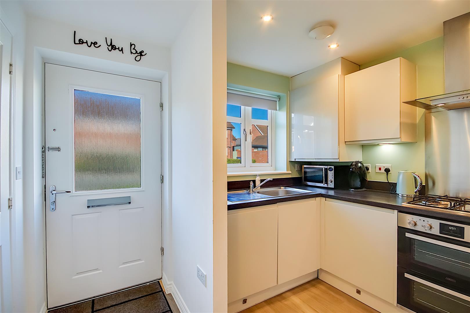 Fitted suite comprising of a single drainer sink unit with mixer taps and having storage cupboard and integrated dishwasher below. Areas of roll top work surfaces offering additional cupboards and drawers under. Matching shelved wall units. Four ring hob with extractor hood over and fitted oven and grill below. Integrated fridge and freezer. Space for washing machine. Wall mounted cupboard housing the homes central heating boiler. Wood effect LVT flooring. Levelled ceiling with spotlights. North aspect double glazed window.