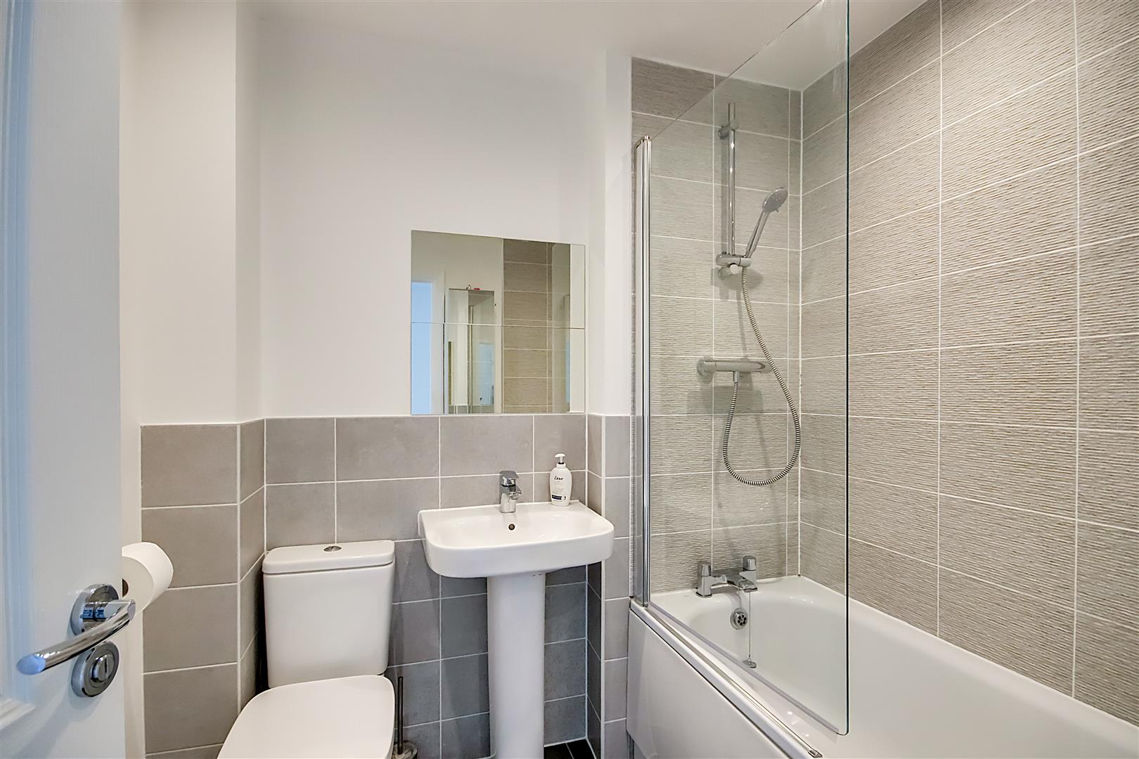 Fitted suite comprising of a panelled bath with mixer taps and having shower attachment and shower screen over. Pedestal wash hand basin with mixer taps. Push button w.c. Radiator. Part tiled walls. Tile effect LVT flooring. Extractor fan. Levelled ceiling with spotlights.