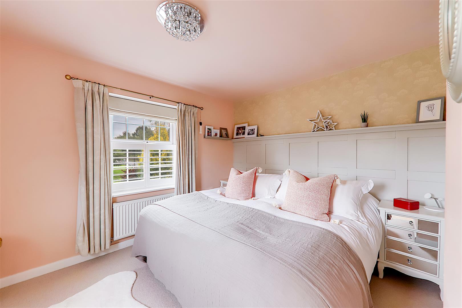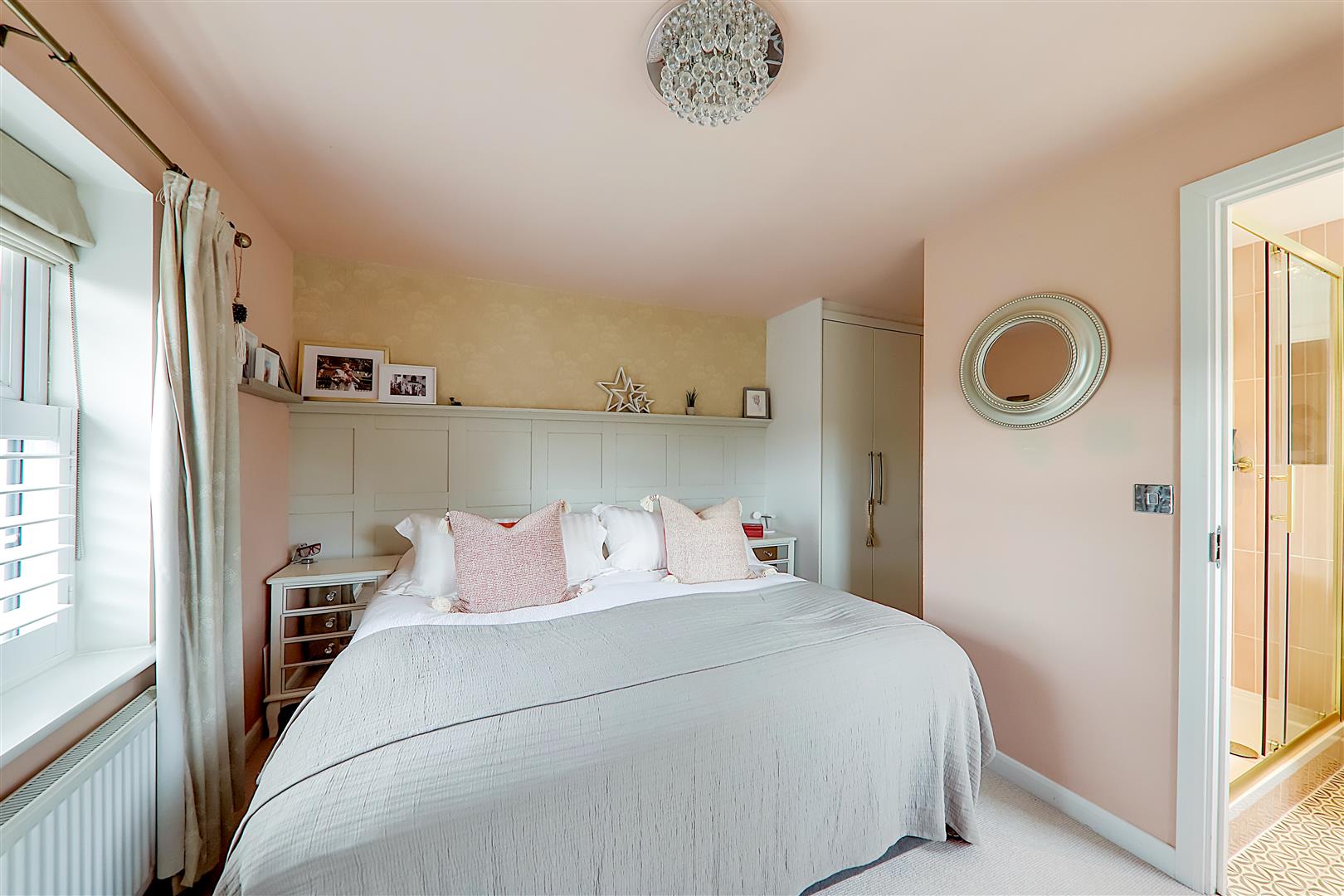 Dual aspect double glazed windows, café style white feature shutter to one window. Fitted 5 door wardrobes. Radiator. Part panelled wall. Door two en-suite.