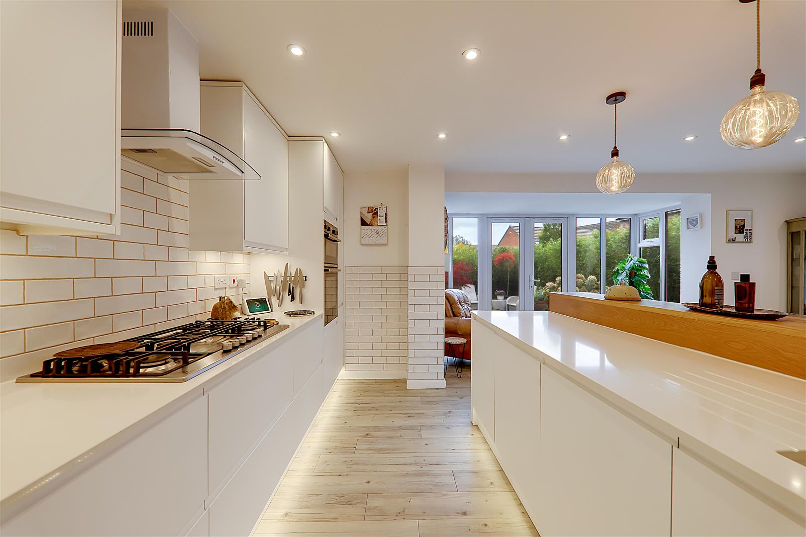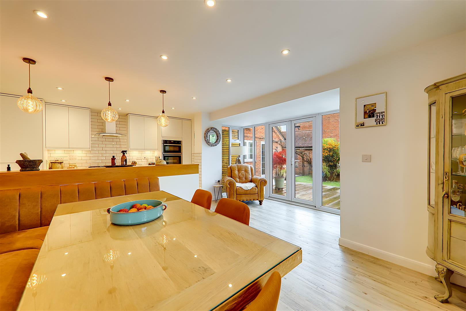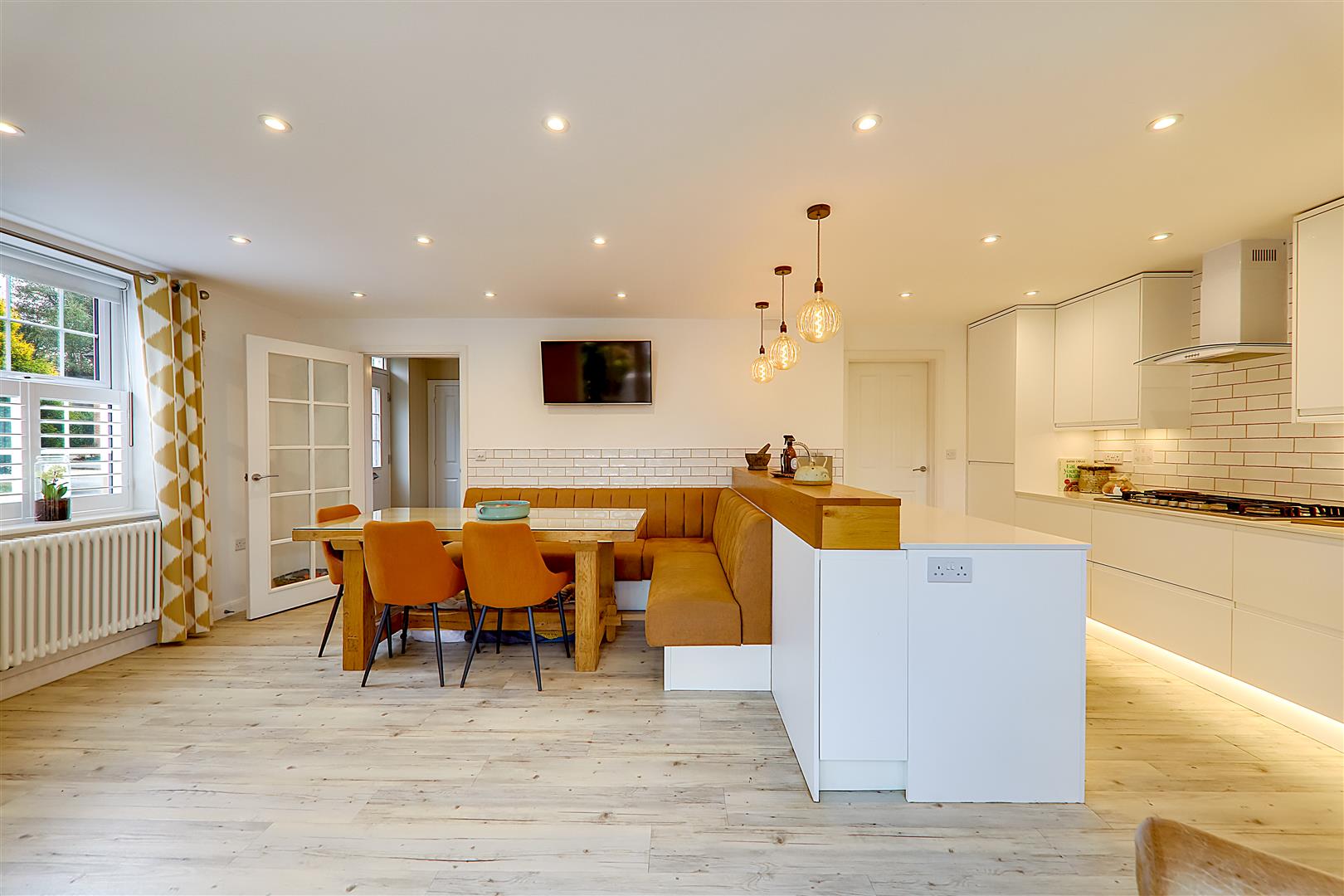 Excellent range of work surfaces with inset sink and quooker tap providing boiling water. Fitted white base cupboards and pan drawers and matching wall cupboards. Integrated fridge and freezer. Six burner gas hob with extractor canopy above. Built in Neff oven and grill. Integrated. Part tiled walls. Inset spotlights and feature three bulb drop lights. Double glazed full height windows with double doors opening onto the deck Terrace area. Double glaze window to side with café style white shutter. Bespoke banquet booth seating with space for large table (table negotiable). LVT flooring. Column style radiator. Door to utility room.
