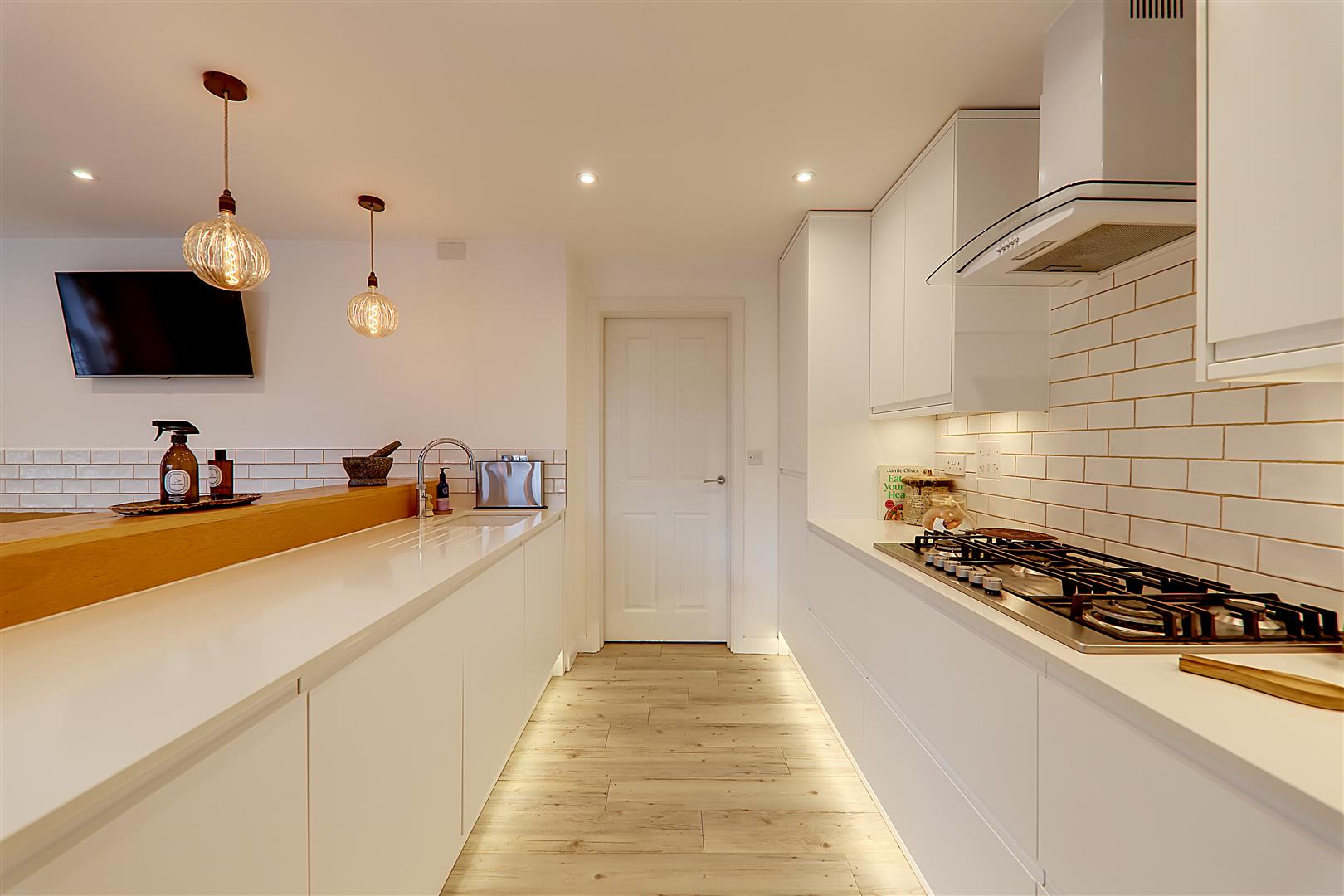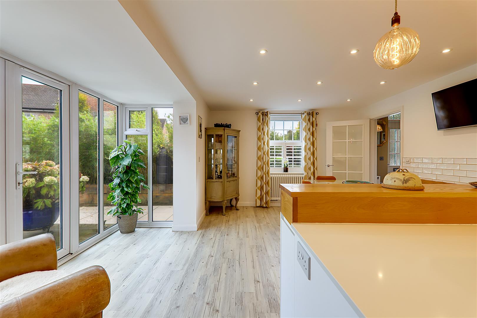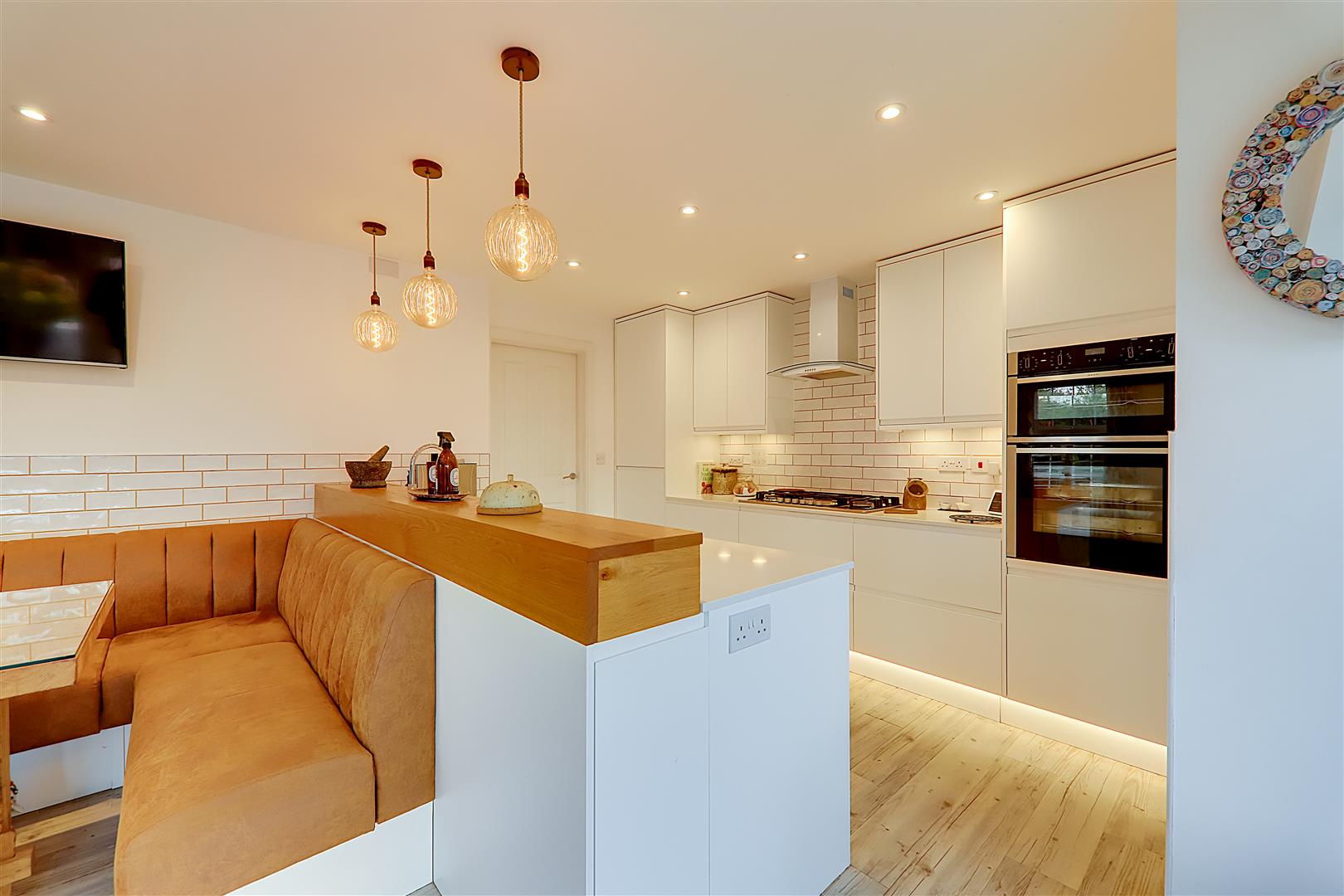 Excellent range of work surfaces with inset sink and quooker tap providing boiling water. Fitted white base cupboards and pan drawers and matching wall cupboards. Integrated fridge and freezer. Six burner gas hob with extractor canopy above. Built in Neff oven and grill. Integrated. Part tiled walls. Inset spotlights and feature three bulb drop lights. Double glazed full height windows with double doors opening onto the deck Terrace area. Double glaze window to side with café style white shutter. Bespoke banquet booth seating with space for large table (table negotiable). LVT flooring. Column style radiator. Door to utility room.