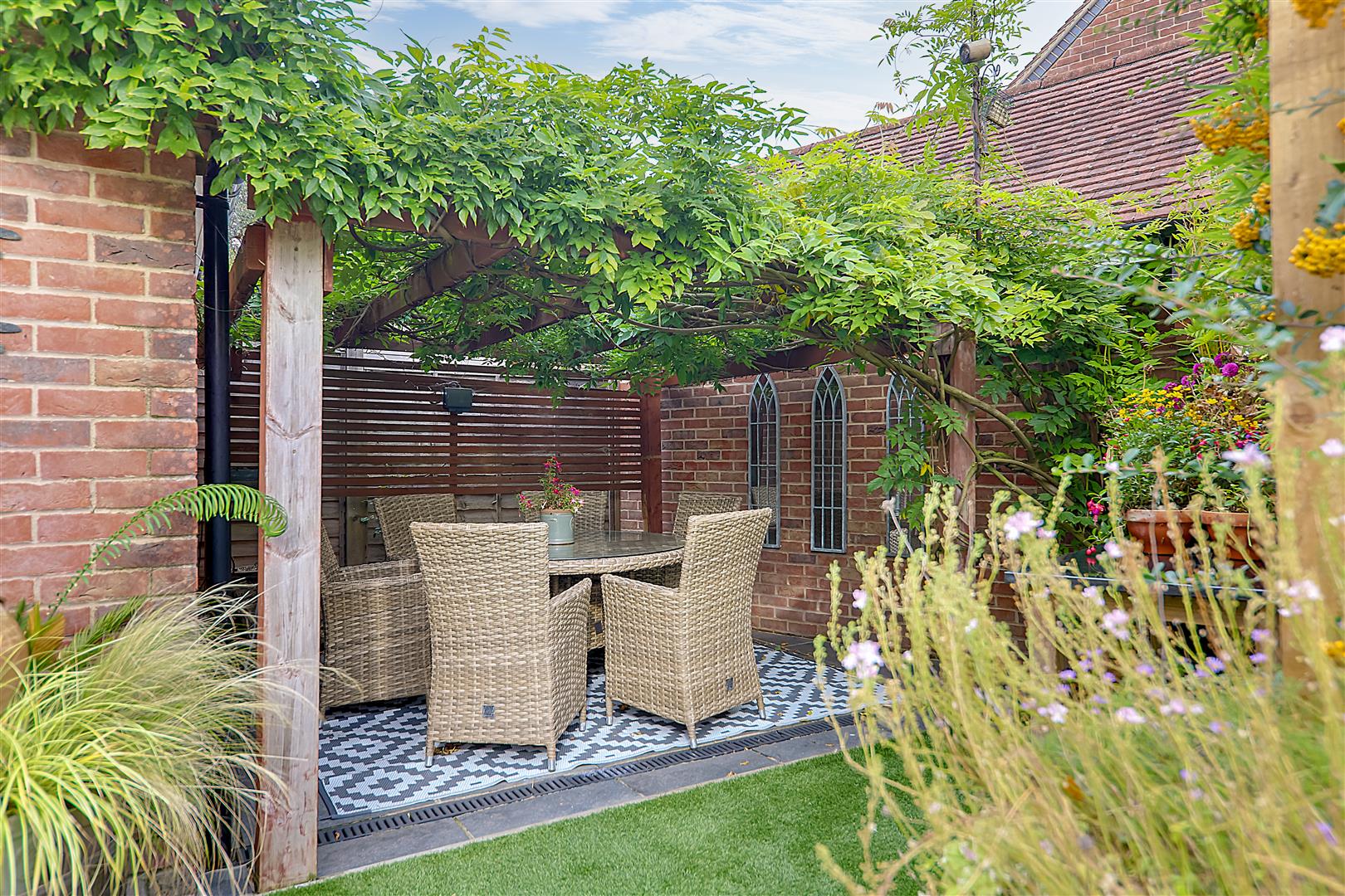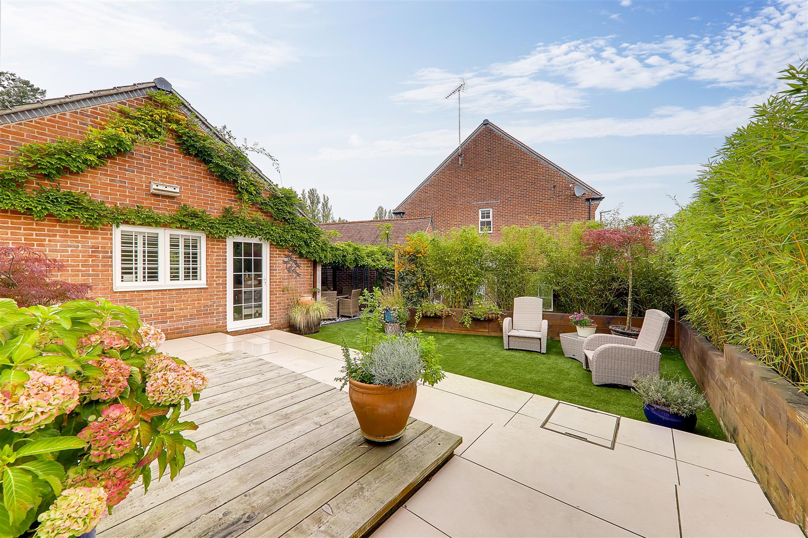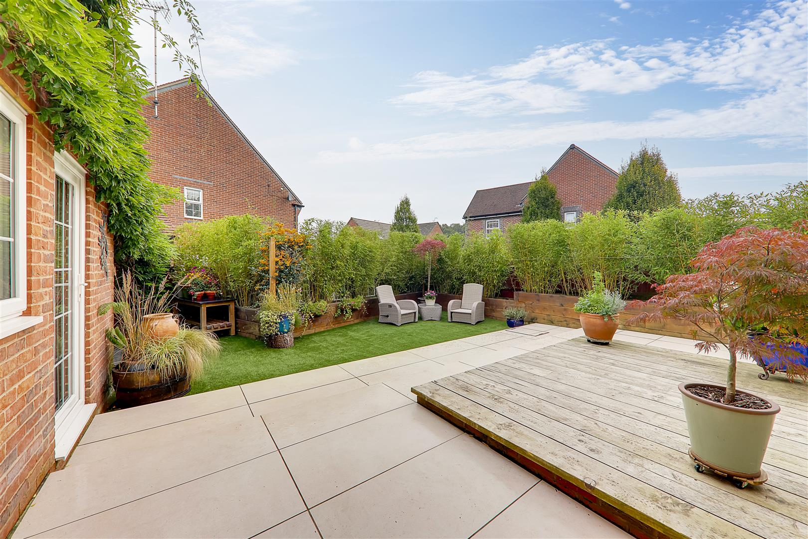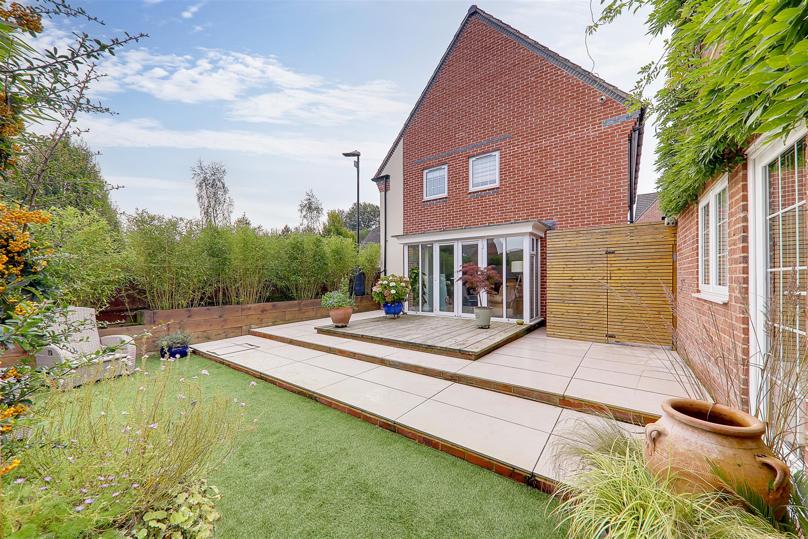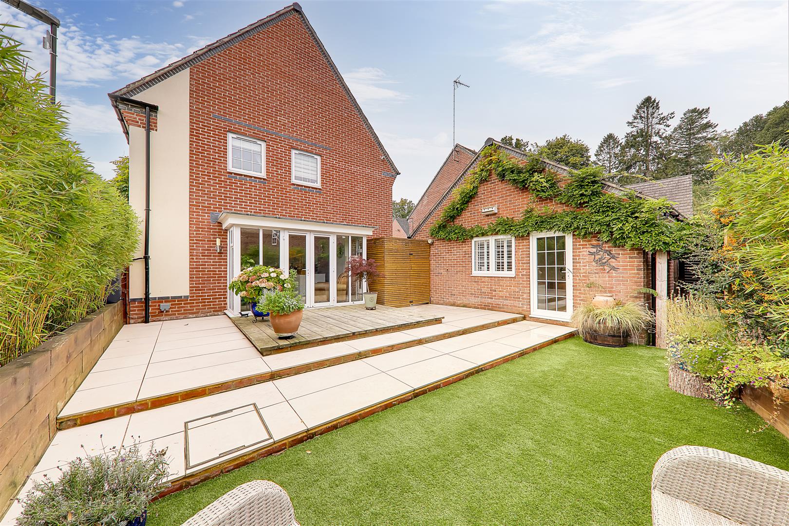 Large patio terrace with timber deck leading down to artificial lawn. Entertaining paved terrace with pergola delightfully positioned behind the garage/office. Raised railway sleeper border. Timber gate giving access to the private driveway. Personal door to the home office.