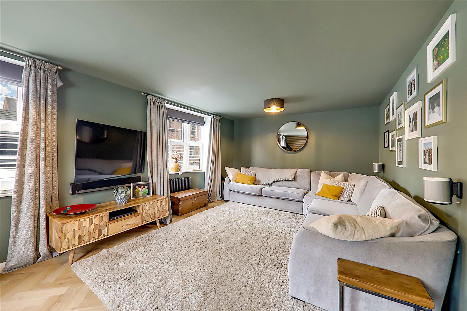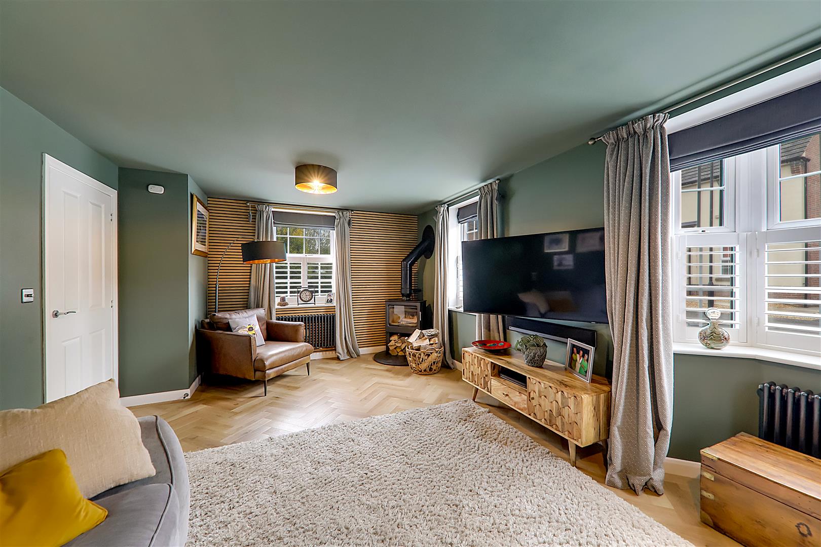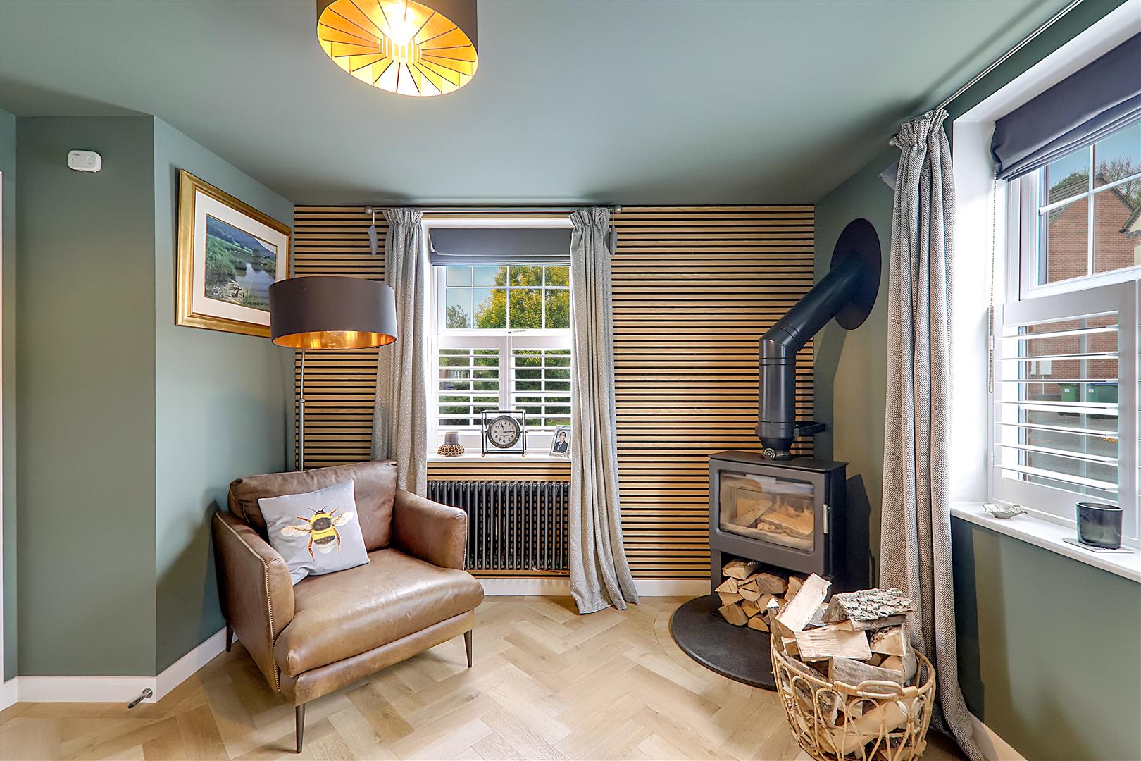 Dual aspect via three double glazed windows with café style white shutters. Two feature column radiators. Herringbone LVT flooring. Feature wood slat wall. Wood burner with circular hearth.