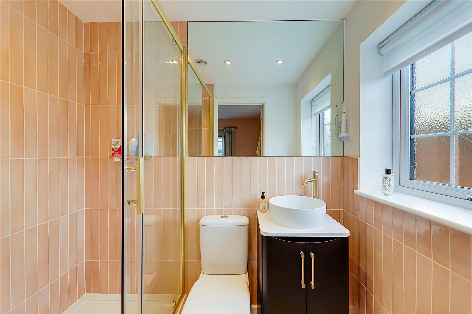 Refitted September 2025 Step in double shower cubicle with sliding glass door and gold effect fittings. Low-level flush WC. Vanity cupboard with circular wash basin and gold effect fittings. Attractive vertical pink part tiled walls. Towel radiator. Double glazed obscure glass window. Inset spotlights and extractor fan. Patterned vinyl floor.