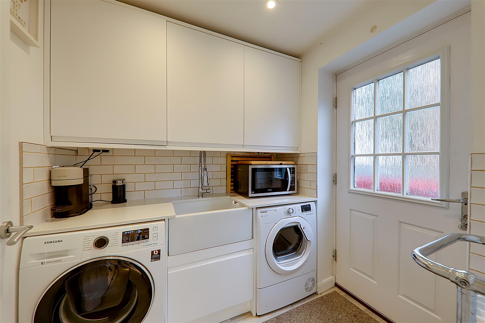 Matching style to the kitchen and comprising work surface with inset butler sink and large under sink cupboard. Space for washing machine and tumble dryer (items are negotiable). Matching wall cupboards one conceals the wall mounted boiler. Column stair radiator with towel rail. Double glazed door to driveway. Part tiled walls. Inset spotlights. Spacious larder/utility cupboard. Continued LVT flooring.