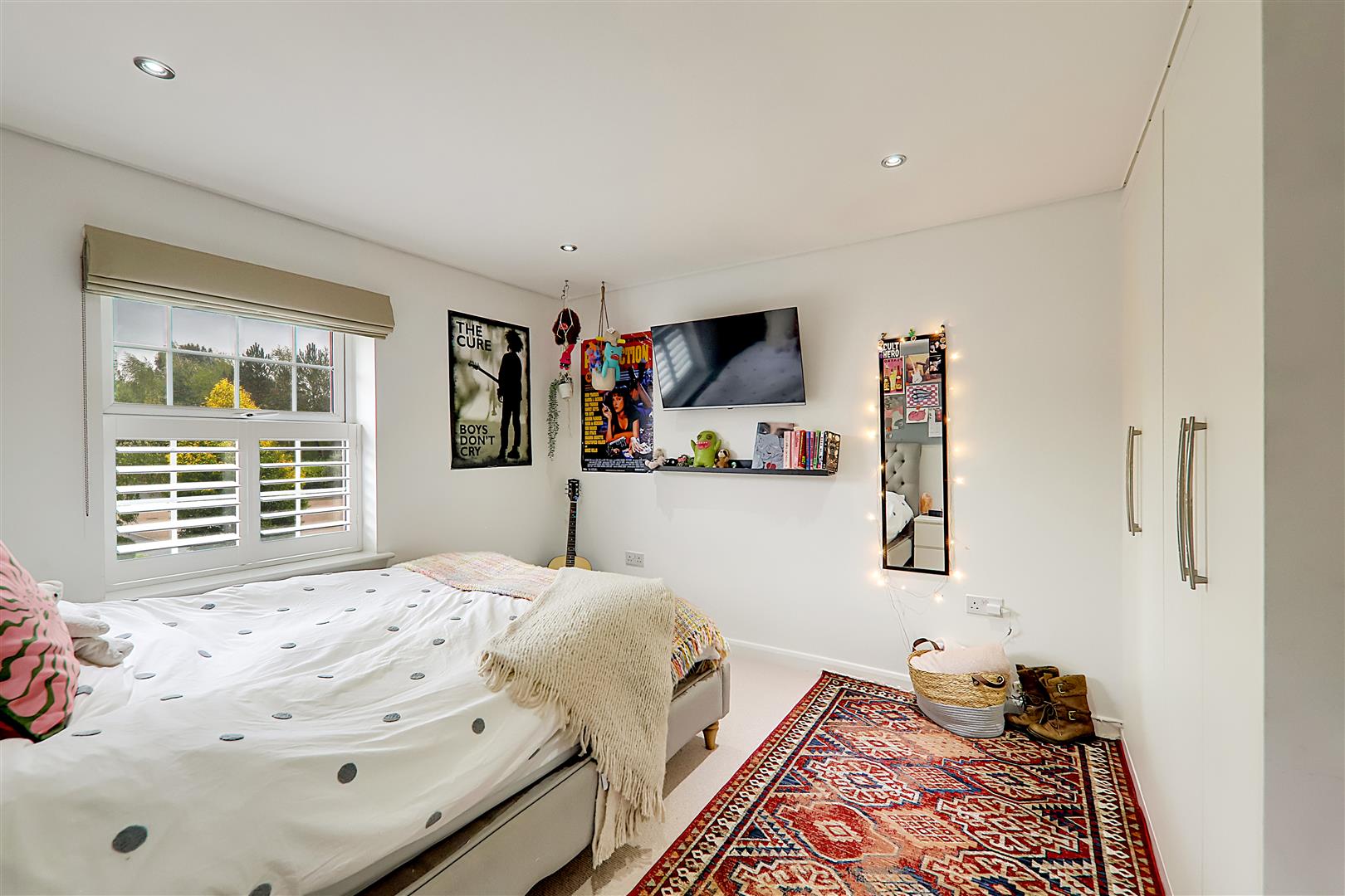 Double glazed window with café style white shutter. Radiator. Two fitted double wardrobes with four fitted shelves into recess. Inset spotlights.