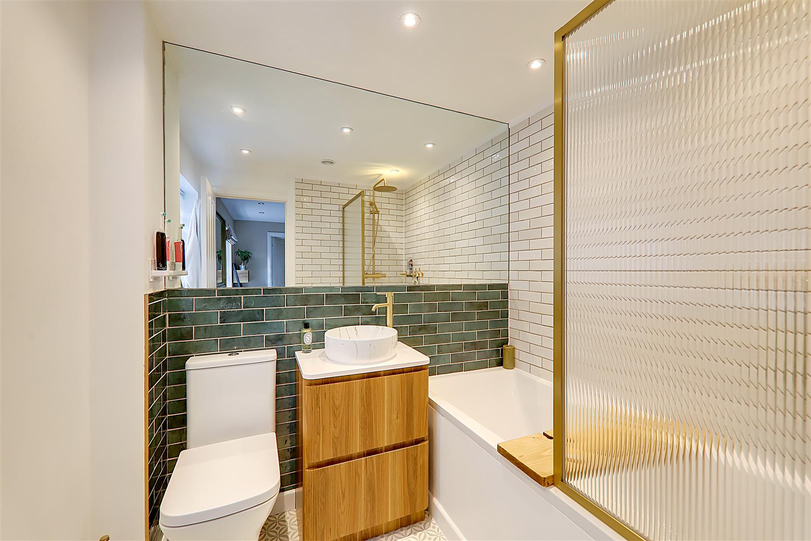 Refitted in October 2025 and comprising panelled bath with gold effect fittings and obscured ribbed glass shower screen, vanity unit with double drawers under, circular basin with gold effect tap and low-level flush WC. Attractive horizontal emerald green and white part tiled walls. Double glazed obscured glass window. Inset spotlights and extractor fan. Patterned vinyl floor.