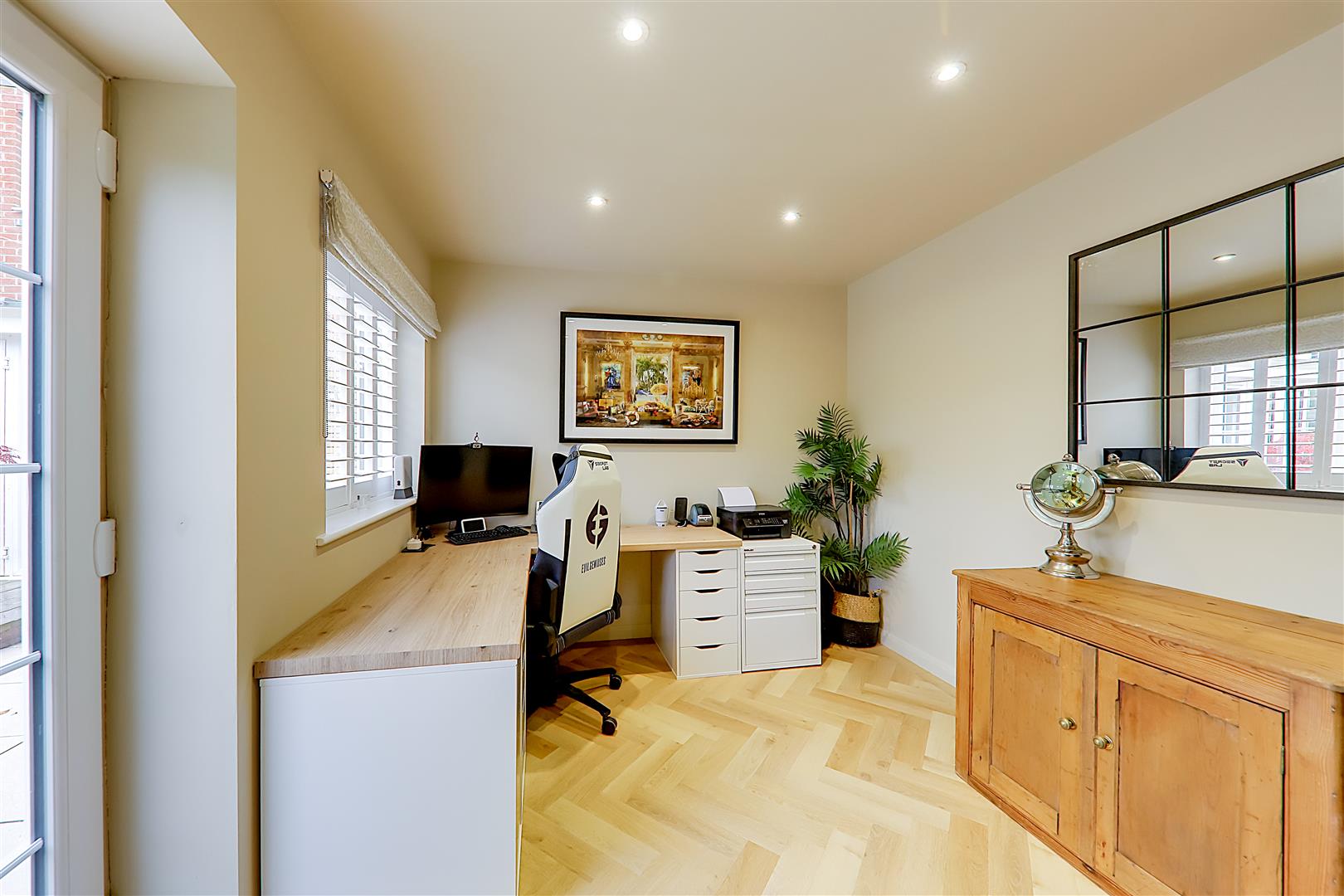 Converted from part of the original garage to form a fantastic home office with double glazed window with fitted white shutters and double glazed door. Wall mounted electric heater. Herringbone LVT flooring. Inset spotlights.