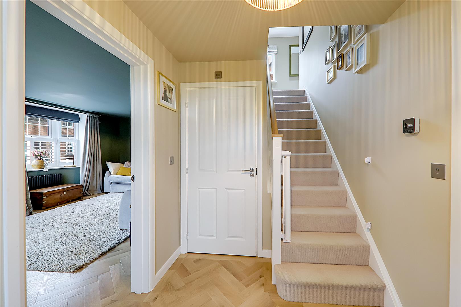 Herringbone LVT flooring. Recessed shelved cupboard. Radiator. Staircase rising to the first floor. Wall mounted central heating thermostat.