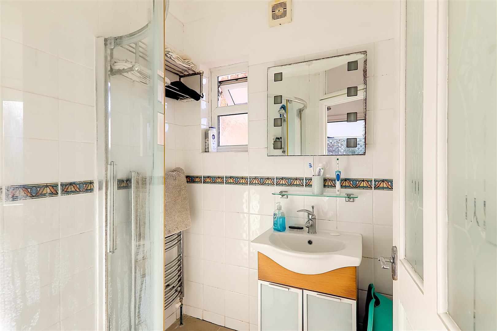 Step in fully tiled corner shower, wash hand basin with cupboard under, heated towel rail, fully tiled walls, double glazed window.