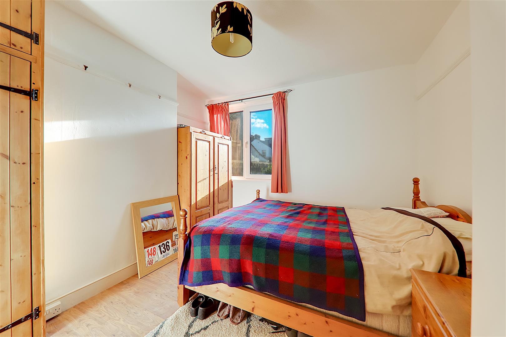 Double glazed window, radiator, double wardrobe with cupboards above.