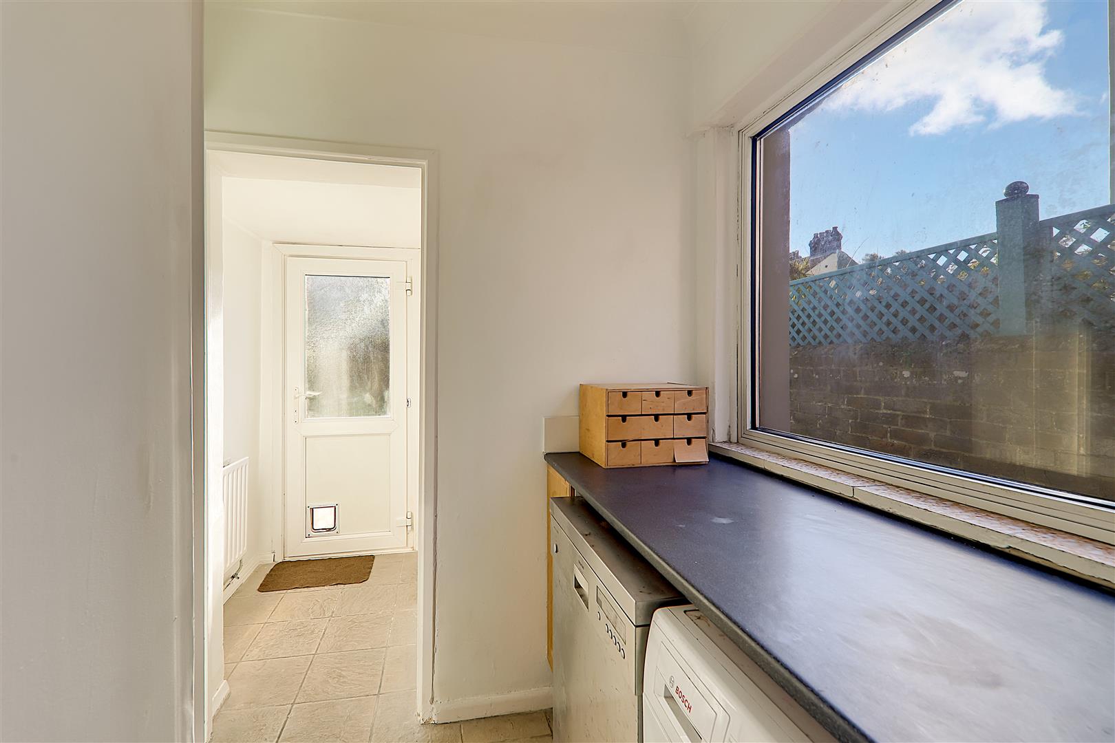Space used for washing machine and dishwasher, double glazed window, tiled flooring, coved ceiling, door to inner hall.