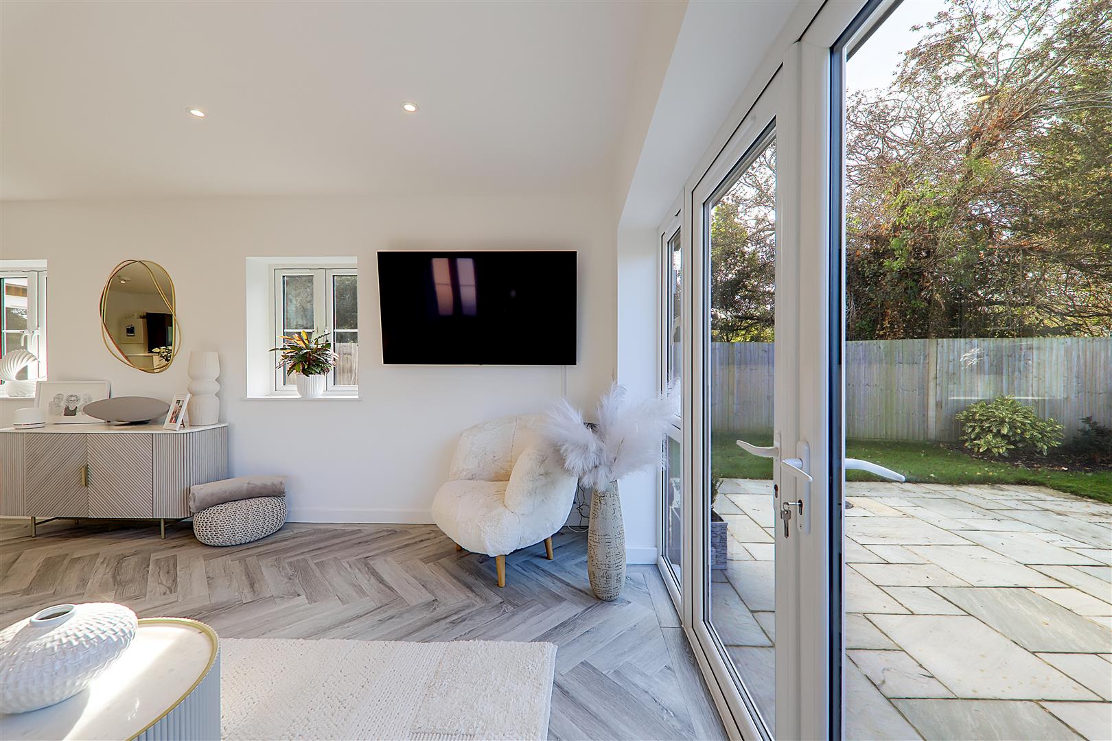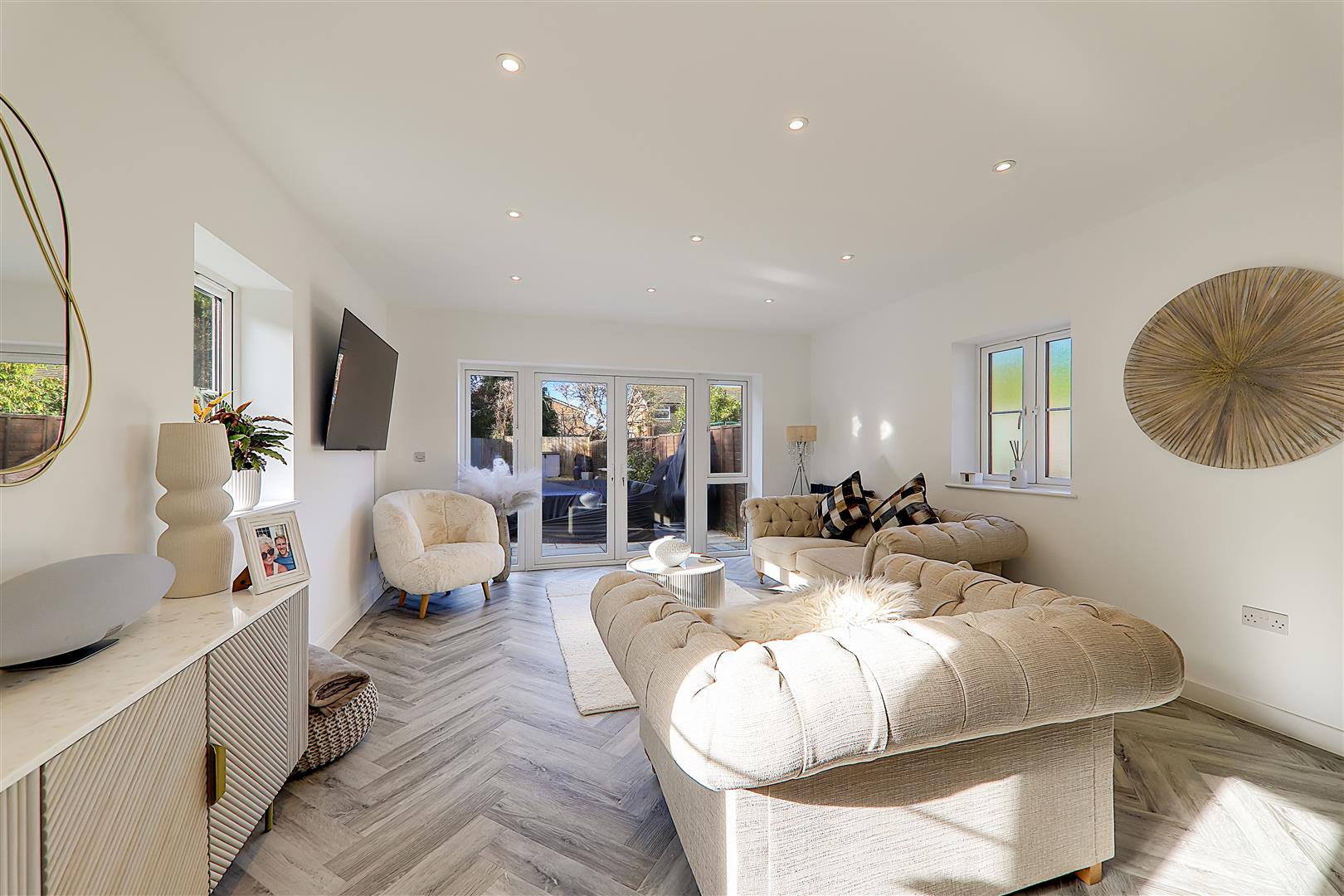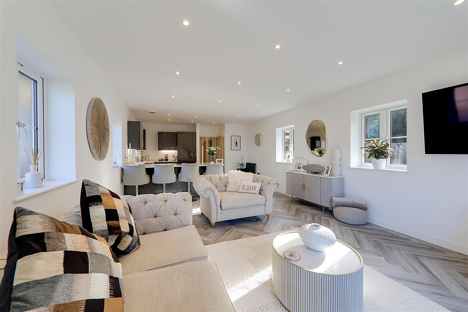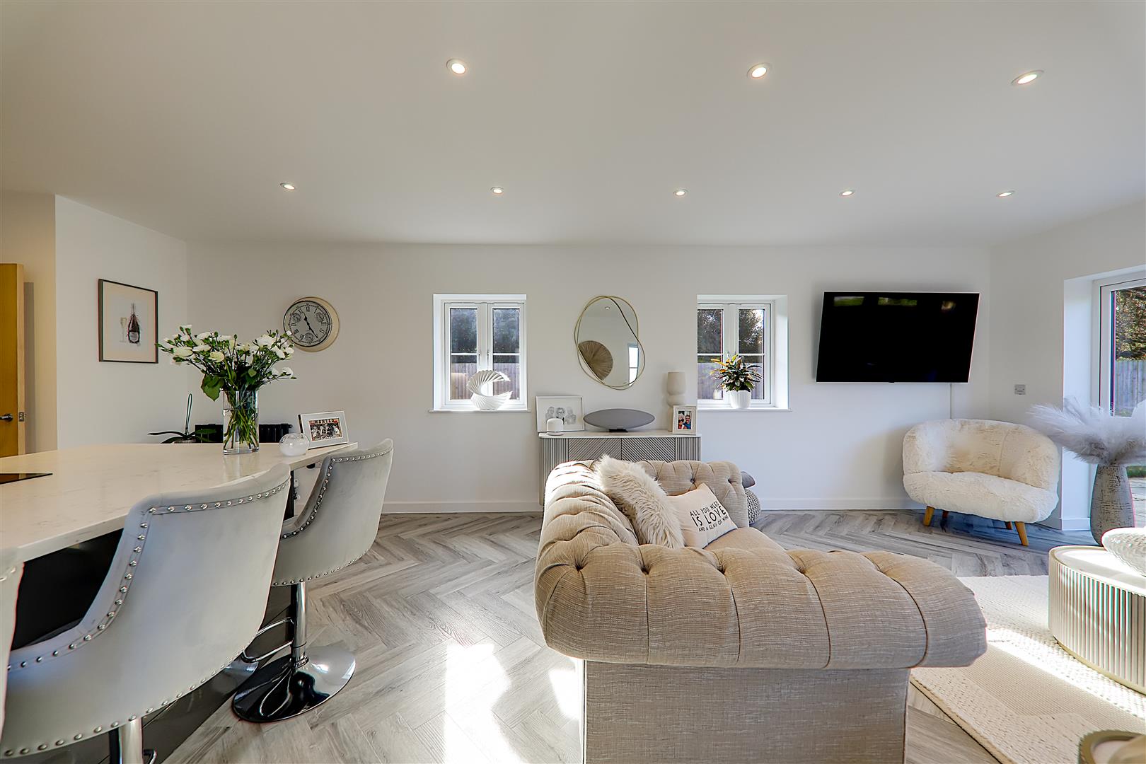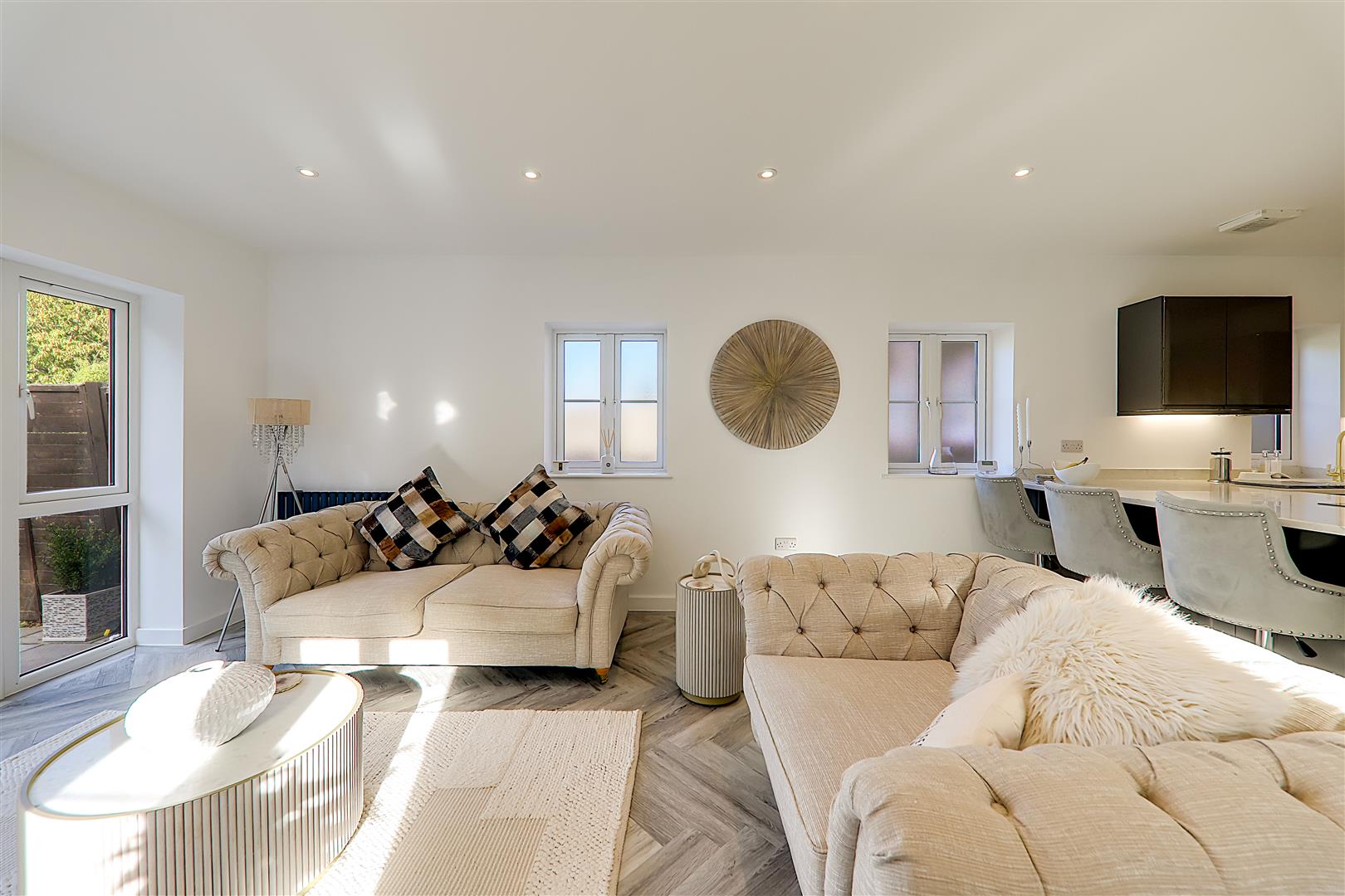 A true feature of the property is the open plan living room which boasts a beautifully finished fitted kitchen area comprising; One and a half bowl single drainer sink unit with a comprehensive range of units and drawers under and over the Quartz work top surfaces. The units have under lighting. Fitted appliances that include dishwasher, washing machine, fridge freezer, four ring hob with over under, smooth ceiling with spotlights, breakfast bar and wall mounted gas fired central heating boiler, smoke detector. Two radiators, range of five double glazed windows and double glazed double opening doors giving a triple aspect and providing access and views over the rear garden. Smooth ceiling with spotlights.
