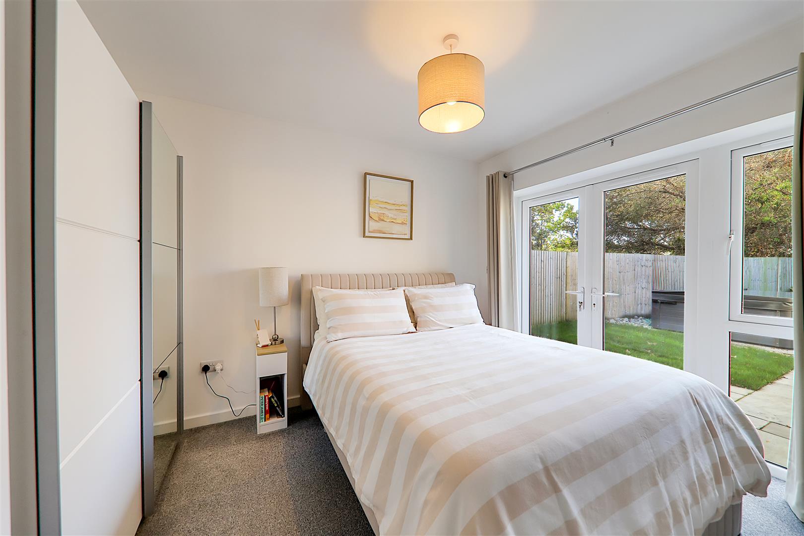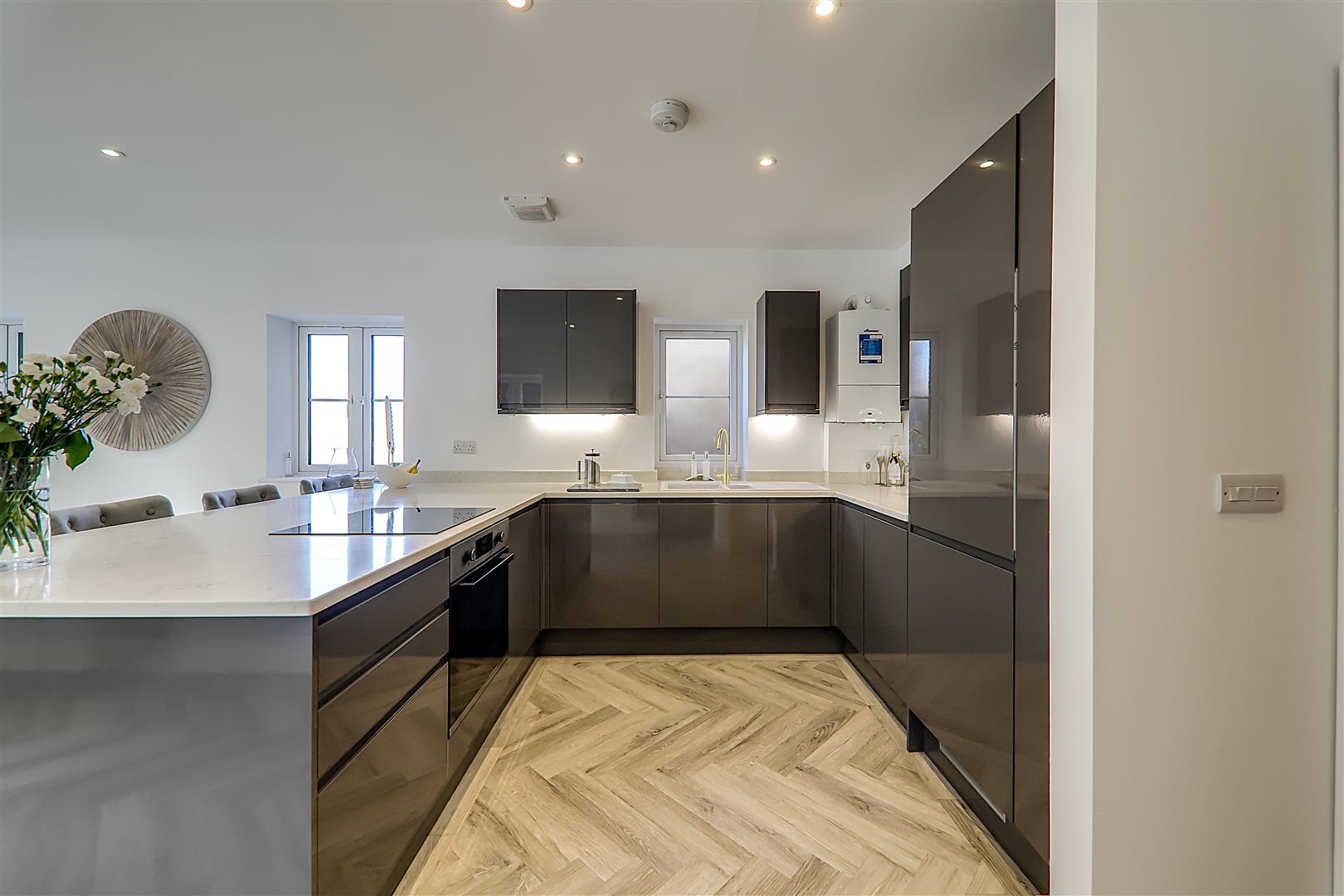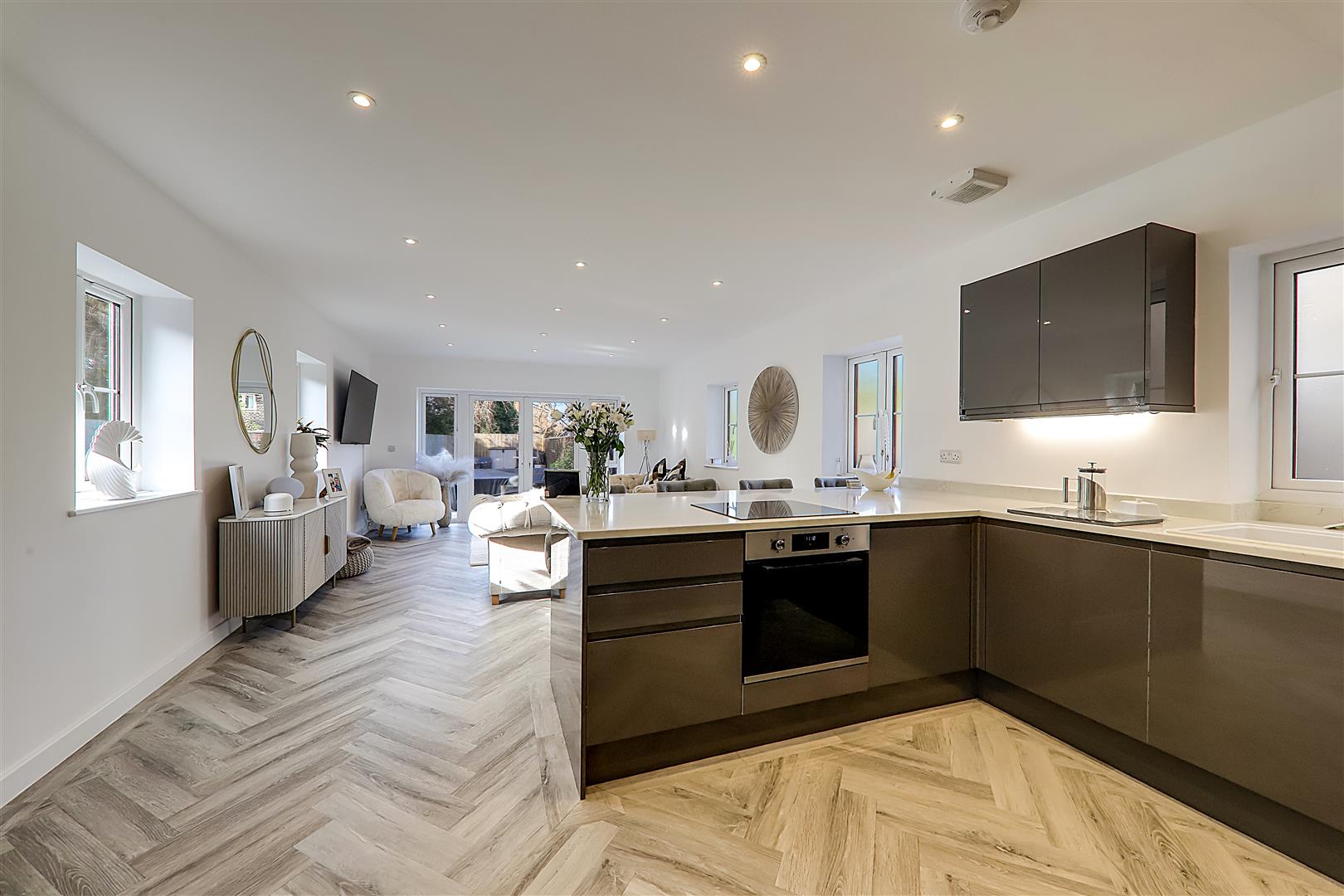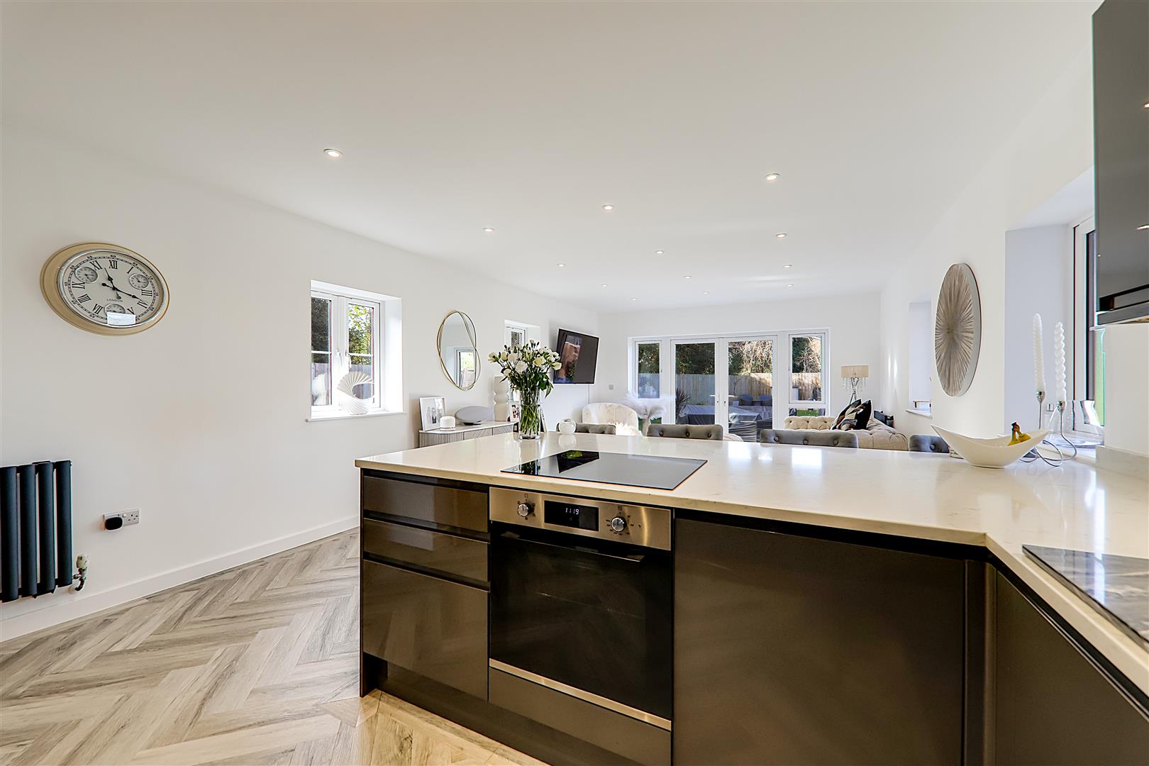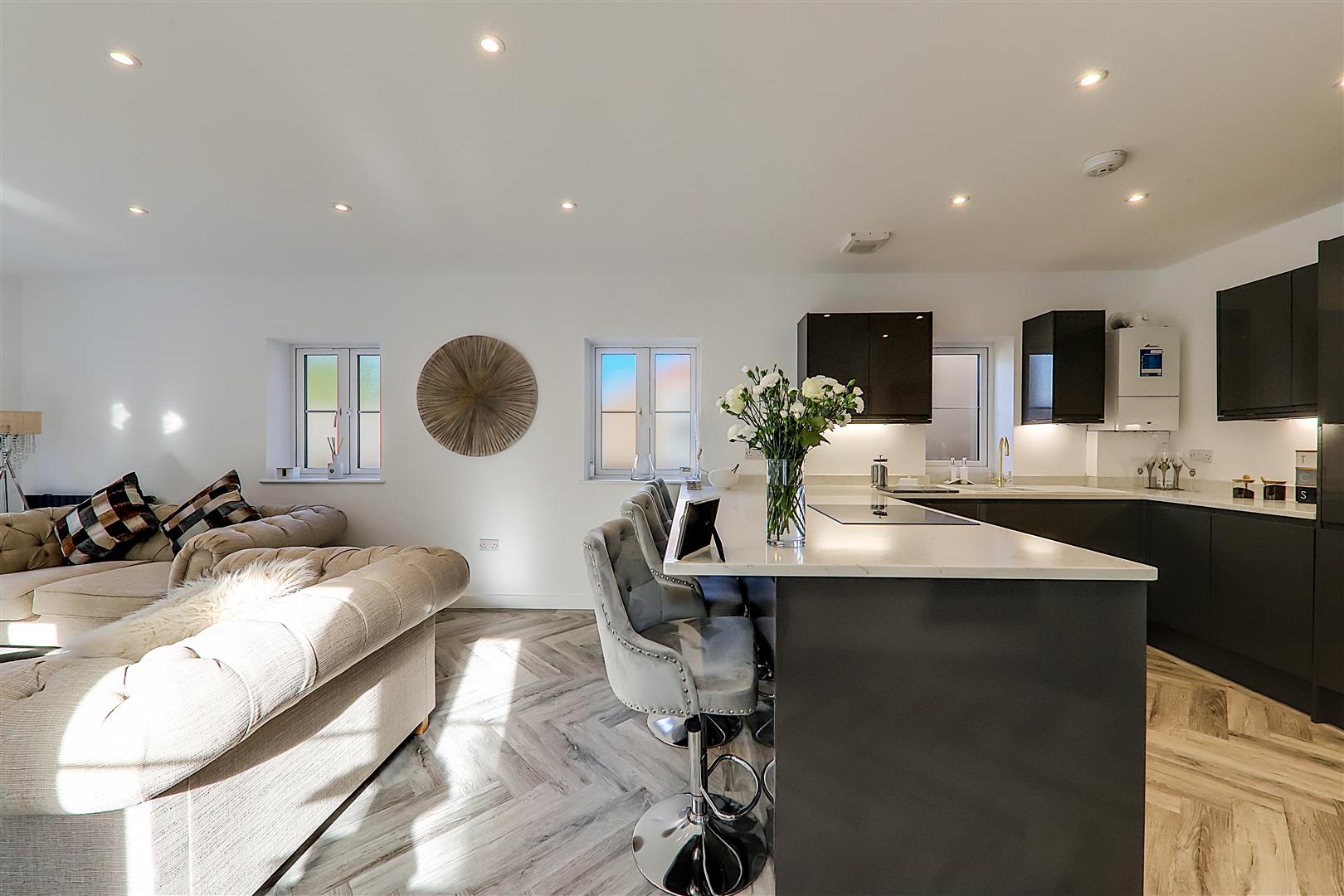 A true feature of the property is the open plan living room which boasts a beautifully finished fitted kitchen area comprising; One and a half bowl single drainer sink unit with a comprehensive range of units and drawers under and over the Quartz work top surfaces. The units have under lighting. Fitted appliances that include dishwasher, washing machine, fridge freezer, four ring hob with over under, smooth ceiling with spotlights, breakfast bar and wall mounted gas fired central heating boiler, smoke detector. Two radiators, range of five double glazed windows and double glazed double opening doors giving a triple aspect and providing access and views over the rear garden. Smooth ceiling with spotlights.