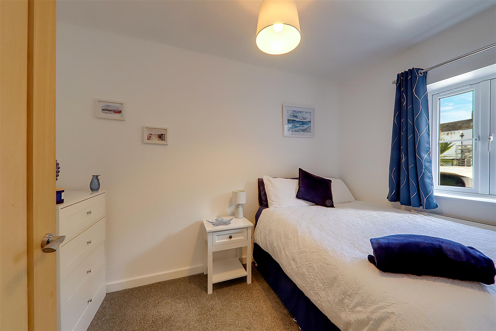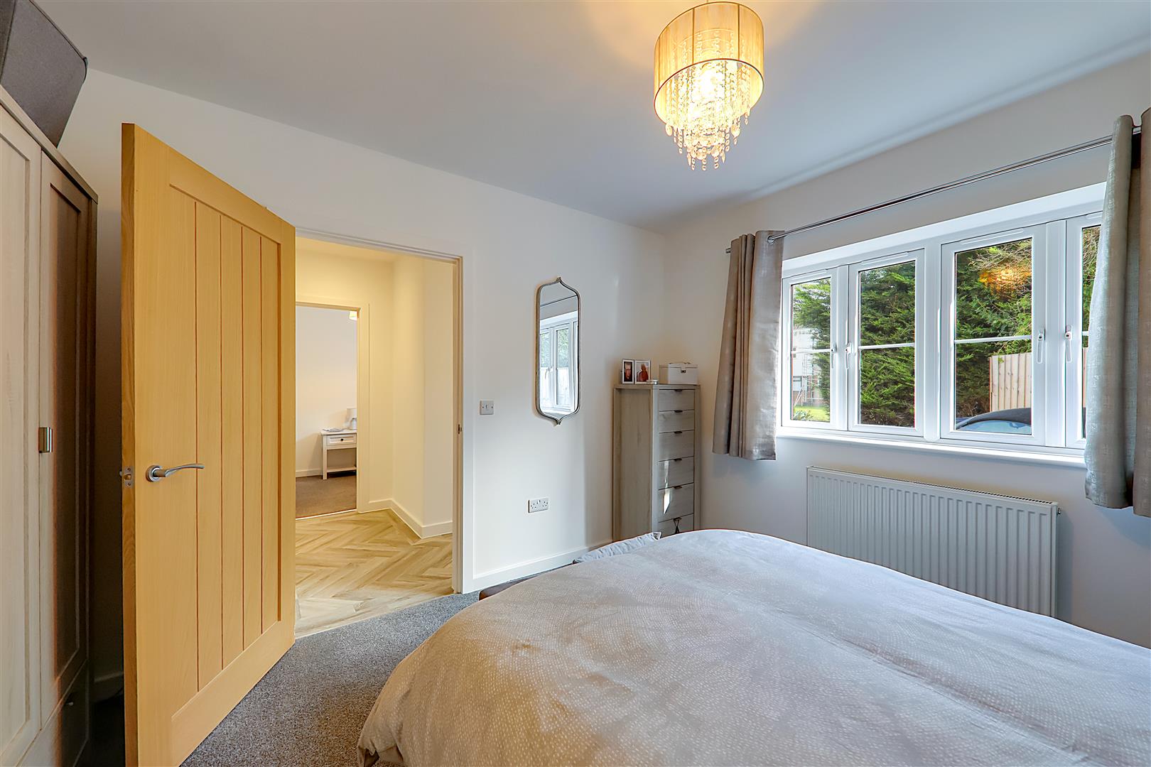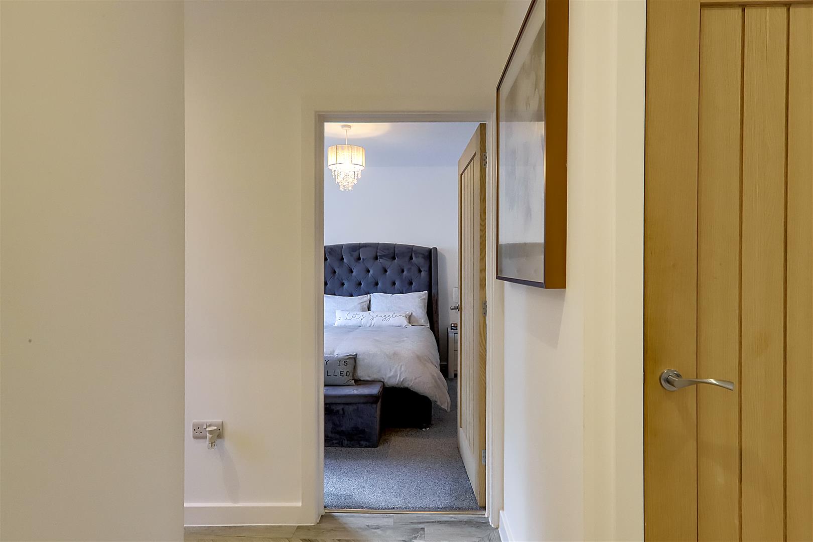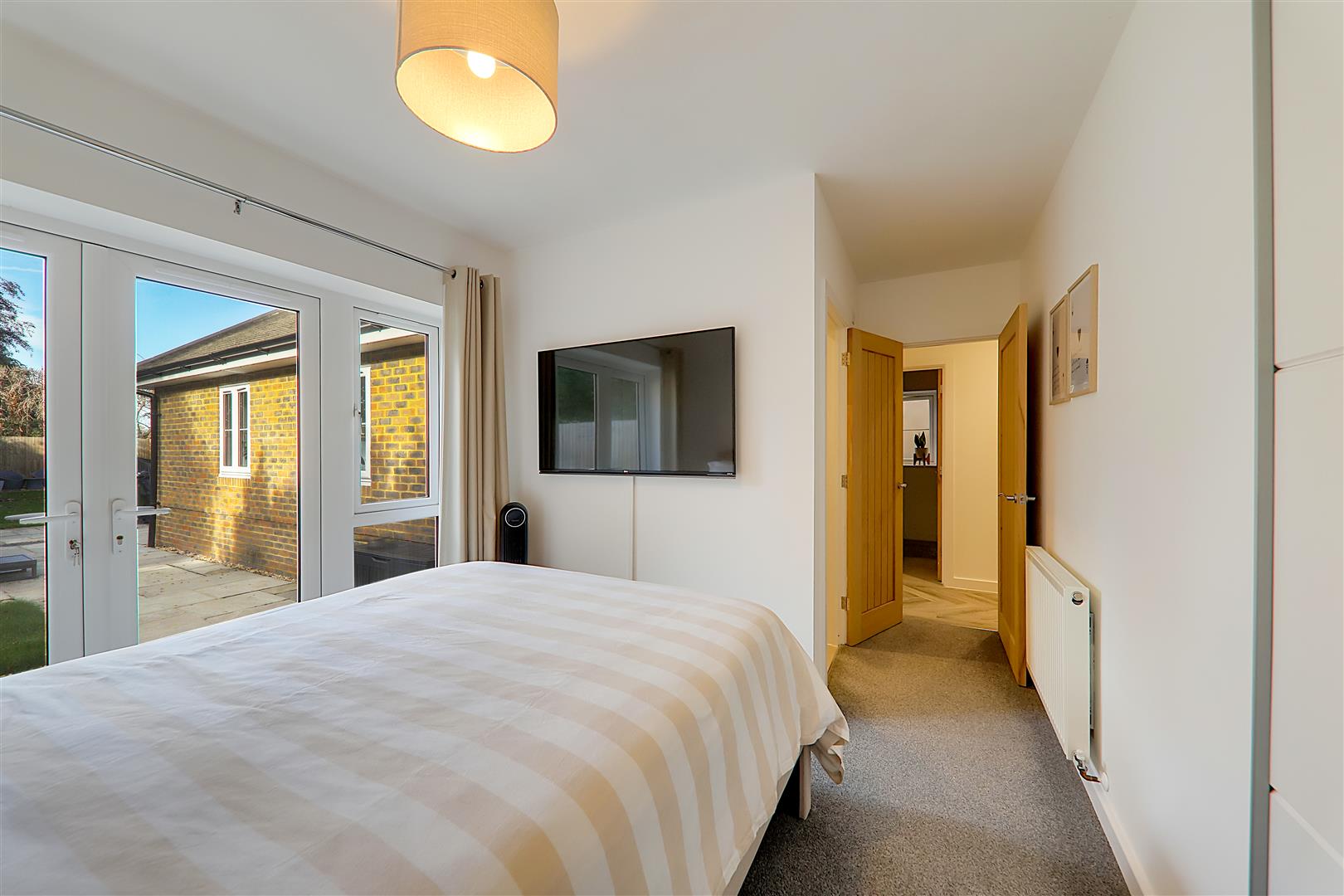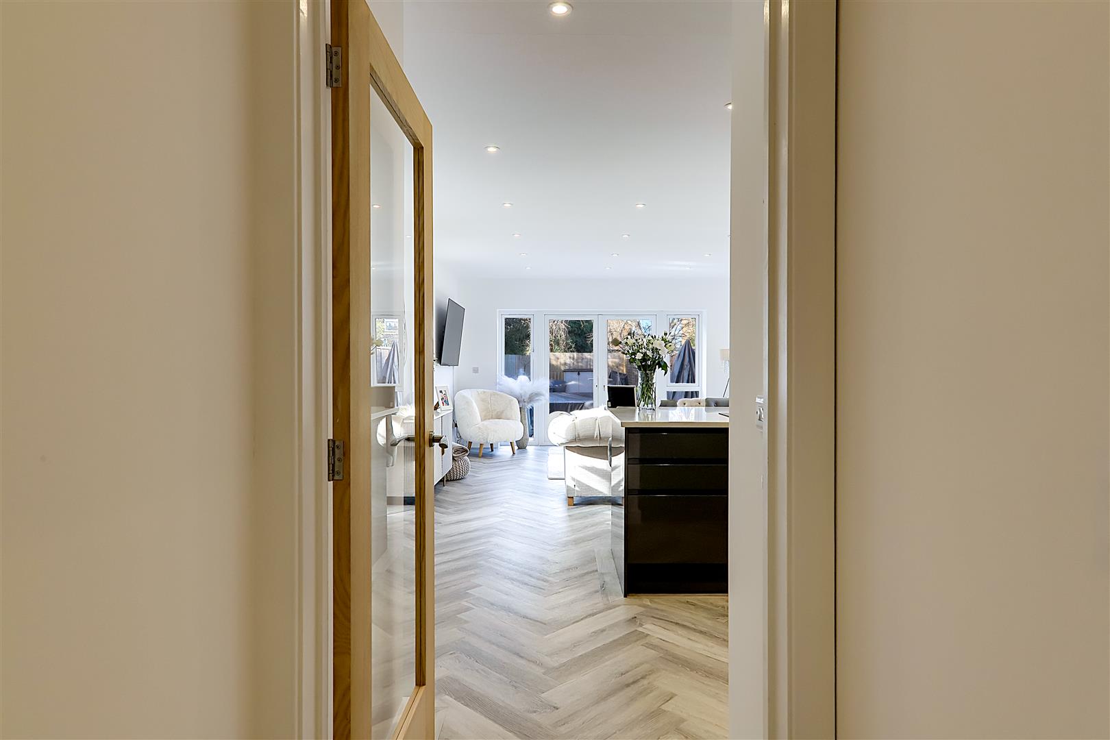 A true feature of the property is the open plan living room which boasts a beautifully finished fitted kitchen area comprising; One and a half bowl single drainer sink unit with a comprehensive range of units and drawers under and over the Quartz work top surfaces. The units have under lighting. Fitted appliances that include dishwasher, washing machine, fridge freezer, four ring hob with over under, smooth ceiling with spotlights, breakfast bar and wall mounted gas fired central heating boiler, smoke detector. Two radiators, range of five double glazed windows and double glazed double opening doors giving a triple aspect and providing access and views over the rear garden. Smooth ceiling with spotlights.