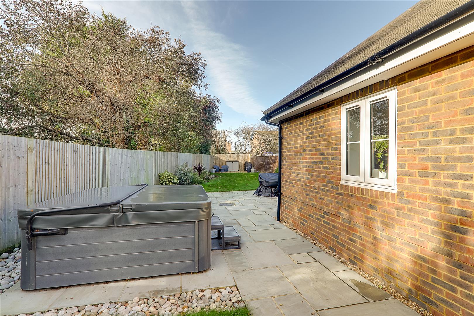 Being mainly laid to lawn, patio, water tap, outside lighting, enclosed by panel fencing