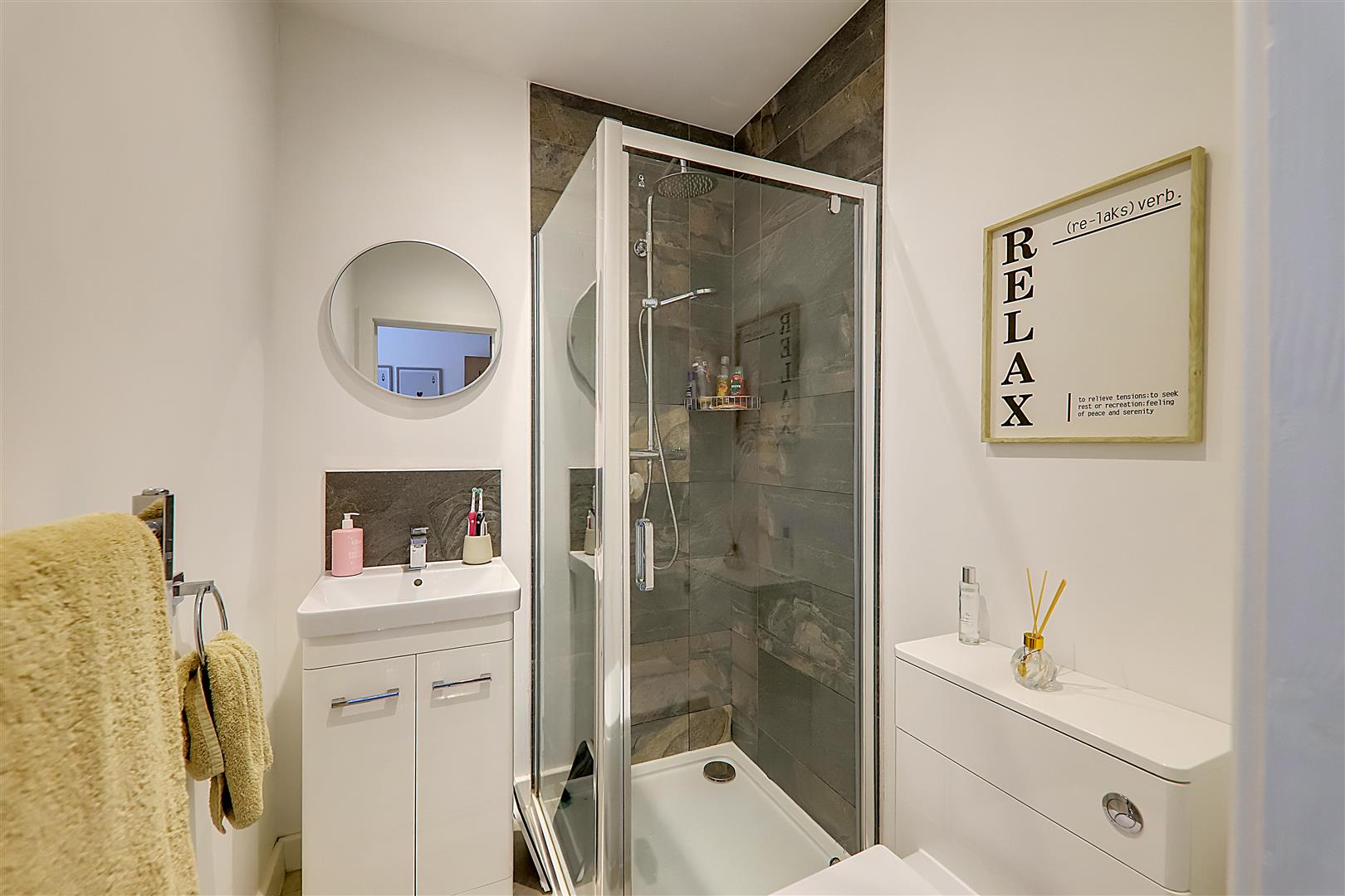 Step in shower cubicle with wall mounted shower with large drench head and side rinser, low level w.c, wash hand basin with cupboard below, heated towel rail, spotlights, extractor unit
