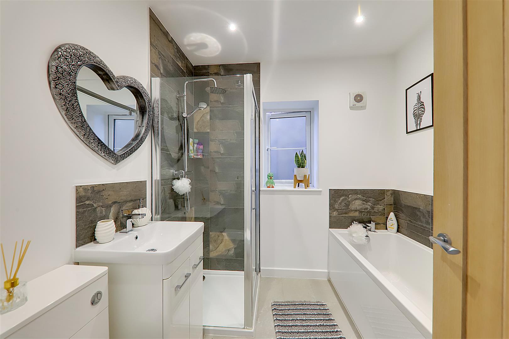 Panelled bath, step in shower cubicle with wall mounted shower, large drench head and side rinser, part tile walls, low level w.c, wash hand basin with cupboard below, smooth ceiling with spotlights, obscured double glazed window