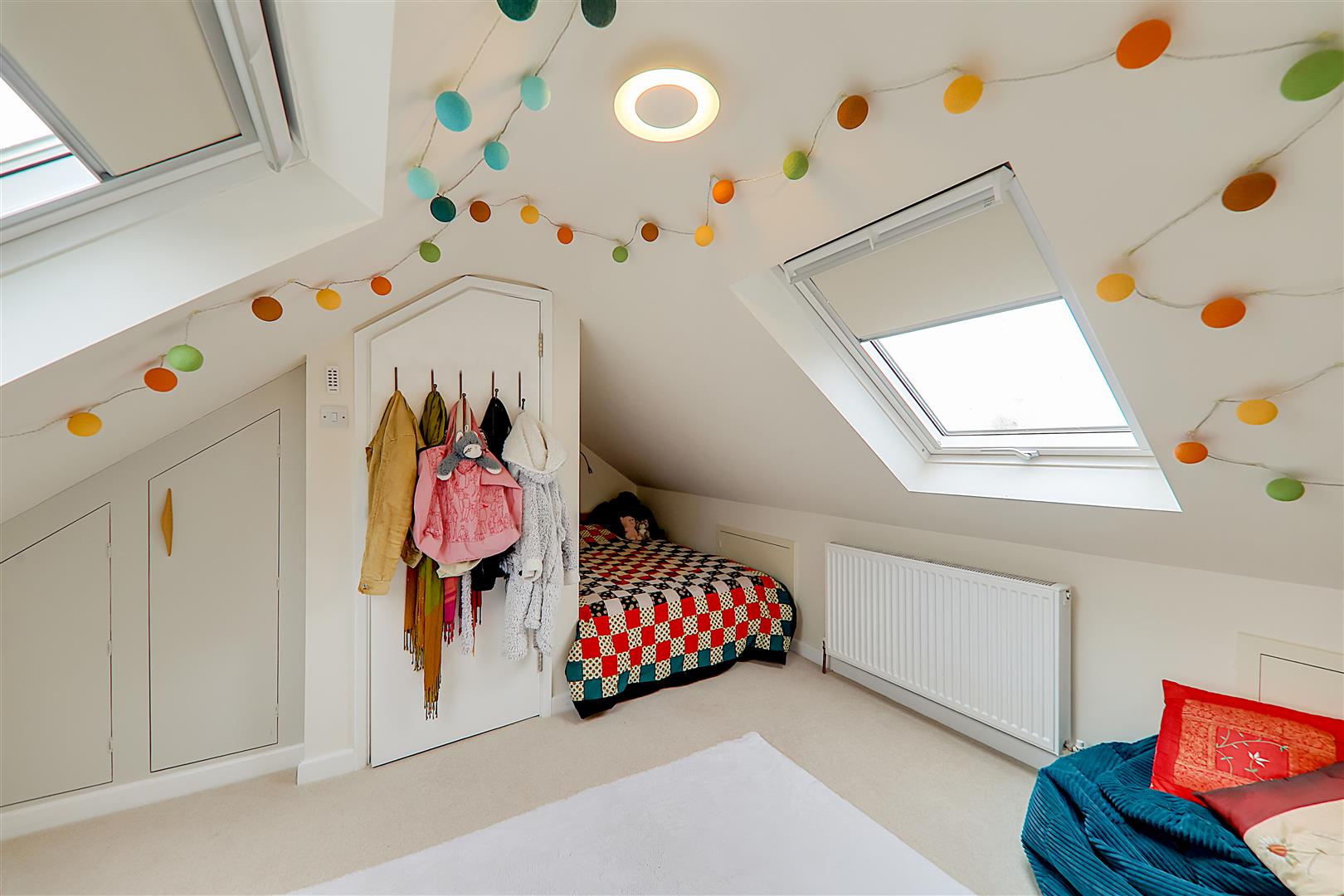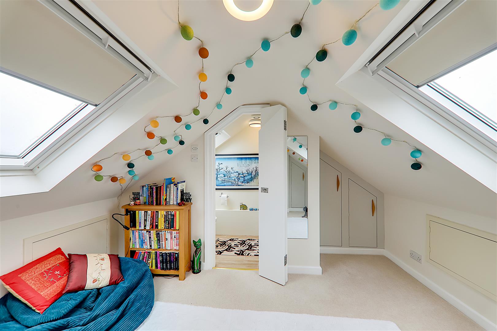 Velux window to East and West aspects. Radiator. Custom built matching storage cupboards. Eaves access doors. Sloped ceilings. Door to wash room/wc.