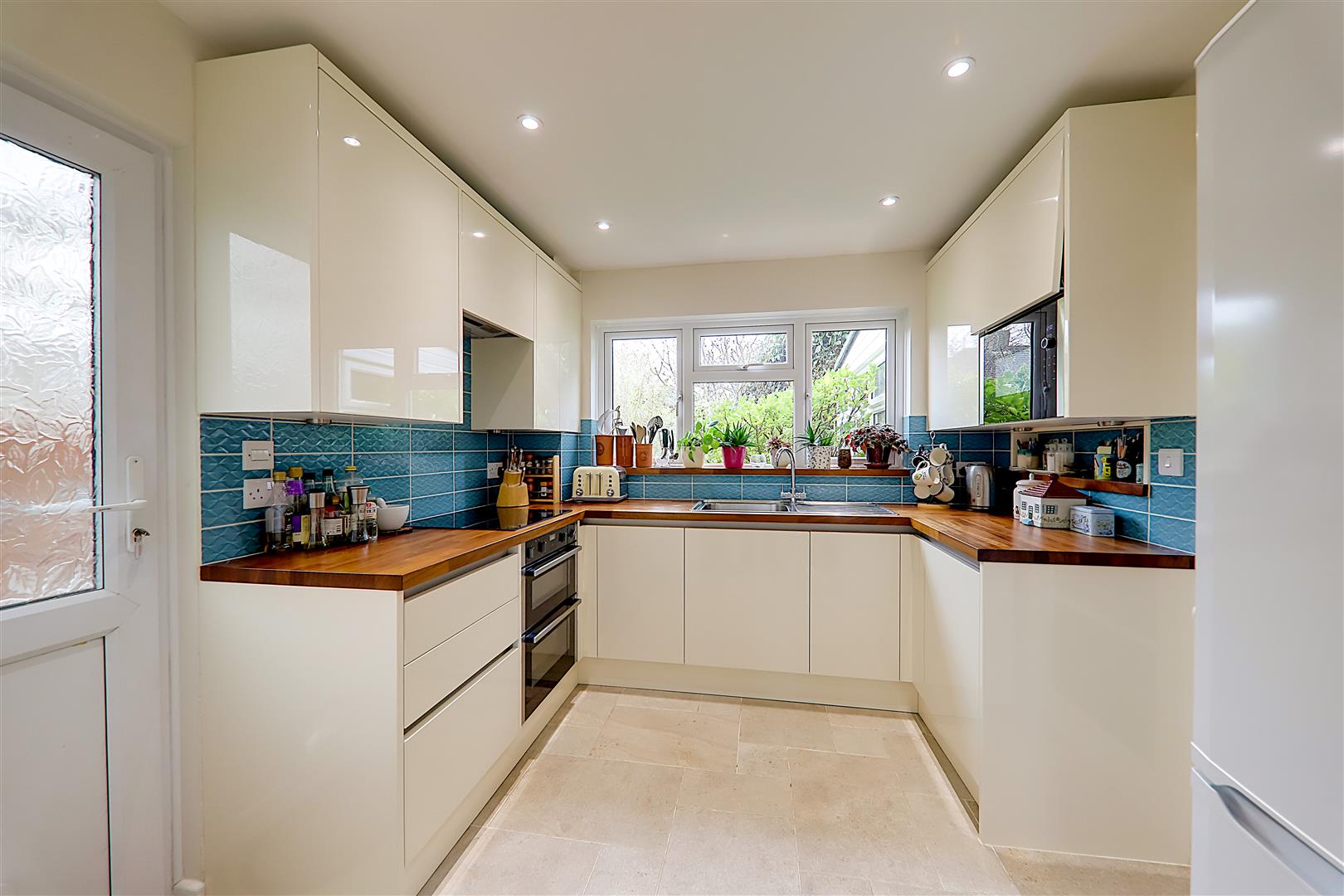 Range of work surfaces with white gloss cupboards and drawers fitted under. Neff hob with oven and grill under and concealed extractor above. Range of matching wall cupboards. Built in Neff high level microwave.