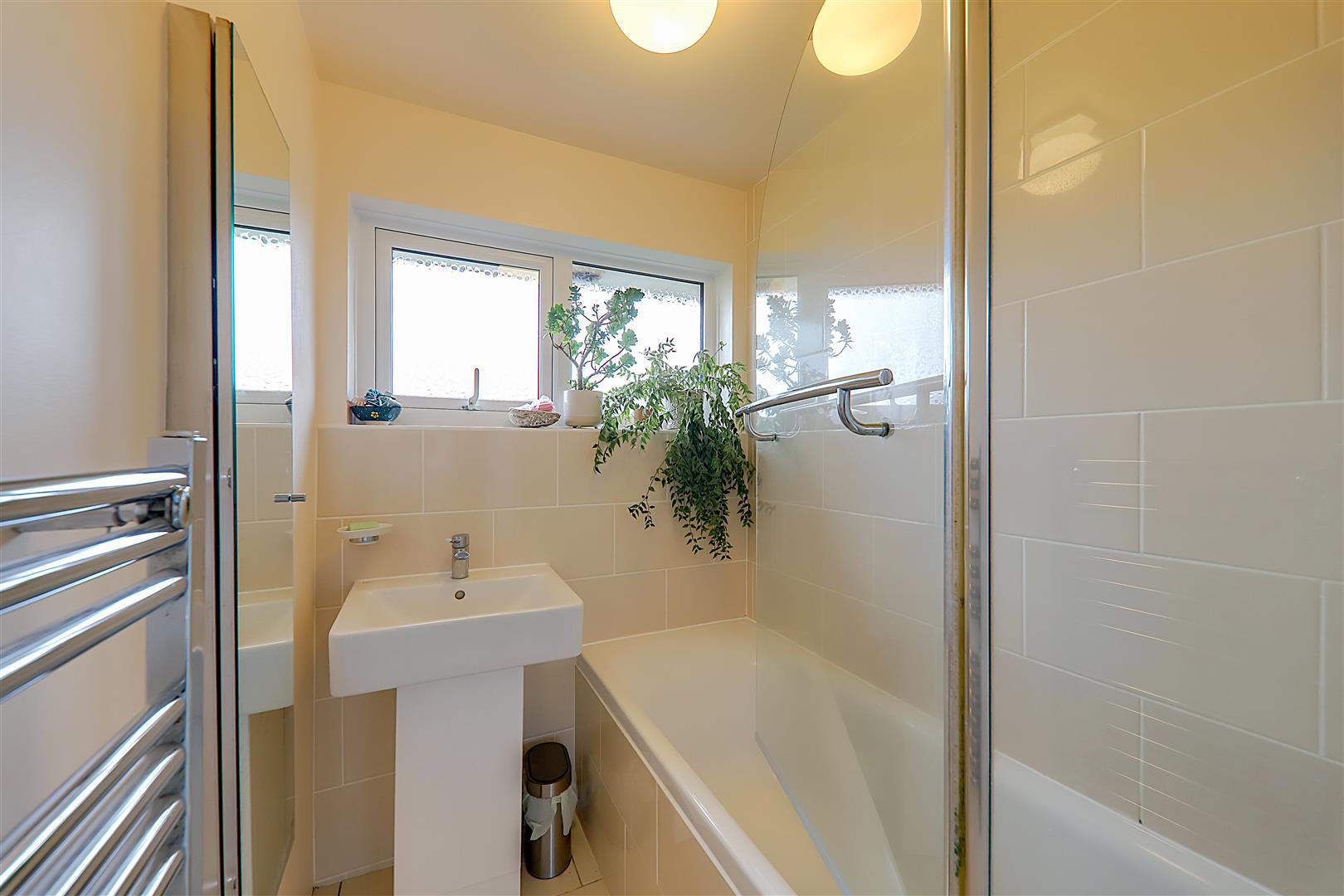Tiled enclosed bath with shower attachment and folding glass door. Pedestal wash hand basin. Part tiled walls. Extractor fan. Double glazed obscure glass window. Wall mounted chrome towel radiator. Tiled floor.