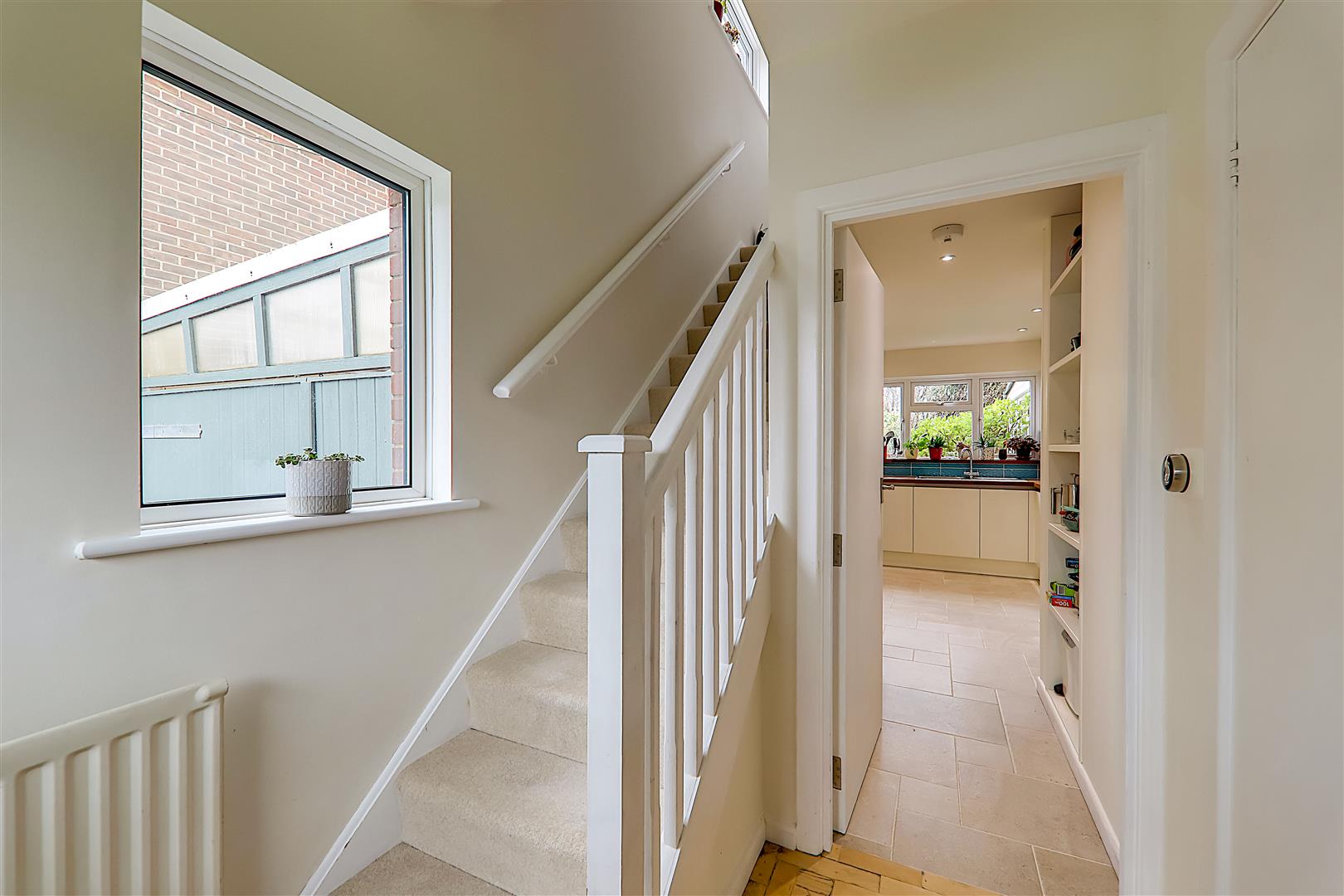 Herringbone wood floor. Double glazed window. Radiator. Wall mounted thermostat control. Recessed cupboard. Staircase rising to first floor.