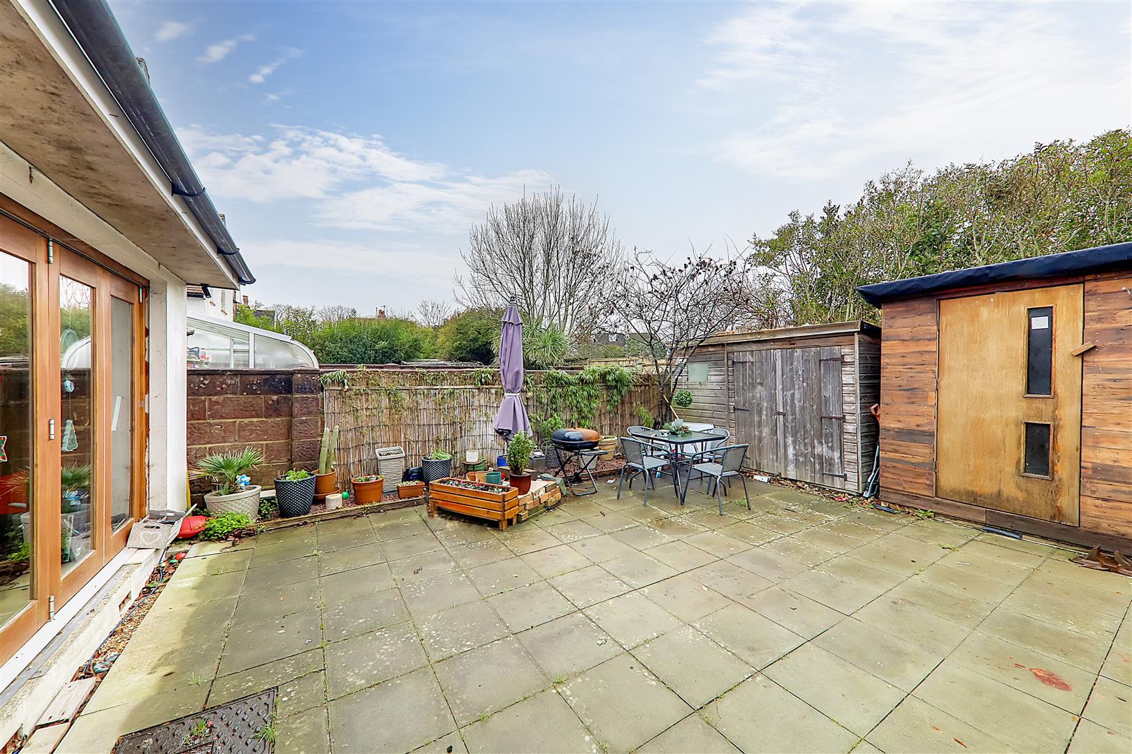 Mainly laid to patio with various flower & shrub borders, gated side access, timber built storage shed with power & lighting, timer built workshop also benefitting from power & lighting, outside power sockets, outside lighting.