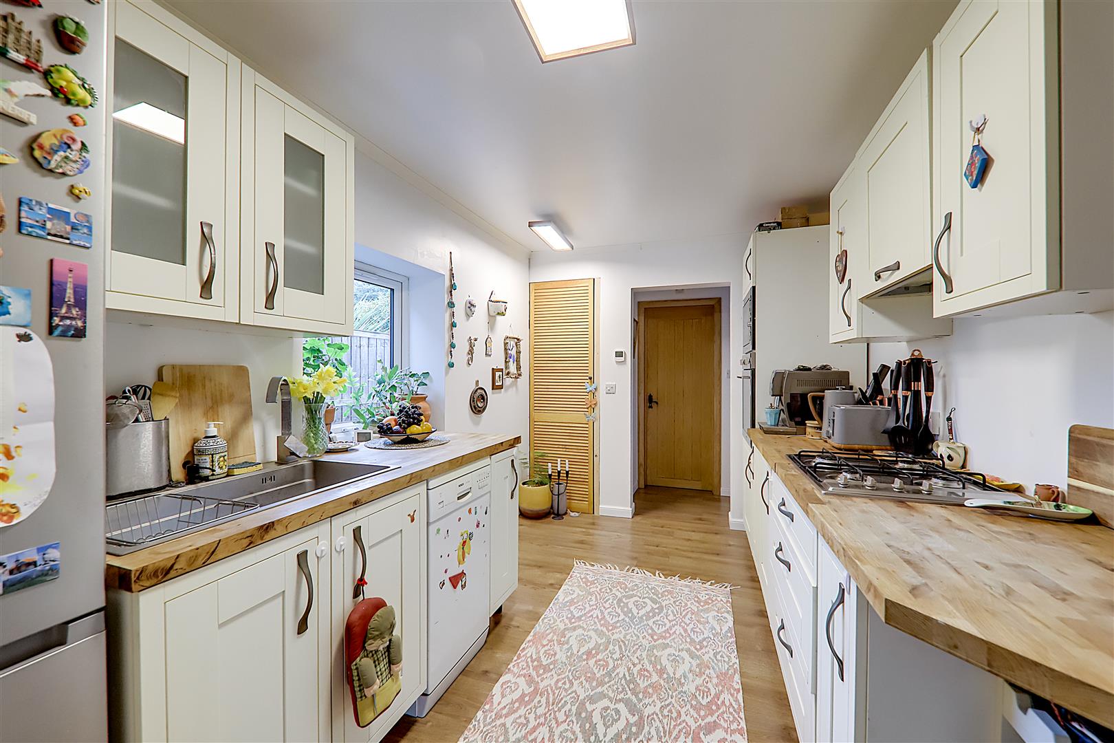 Laminate flooring, underfloor heating, square edge solid wooden work surfaces with cupboards below & matching eye level cupboards, integrated eye level Smegg oven & Smegg microwave, inset Smegg four ring gas hob with extractor fan above, specafe & provision for dishwasher, space for fridge freezer, inset stainless steel sink unit with mixer tap, PVCU double glazed window, fitted storage cupboard housing Vaillant combination boiler, skimmed ceiling with coving, opening into open plan living room.