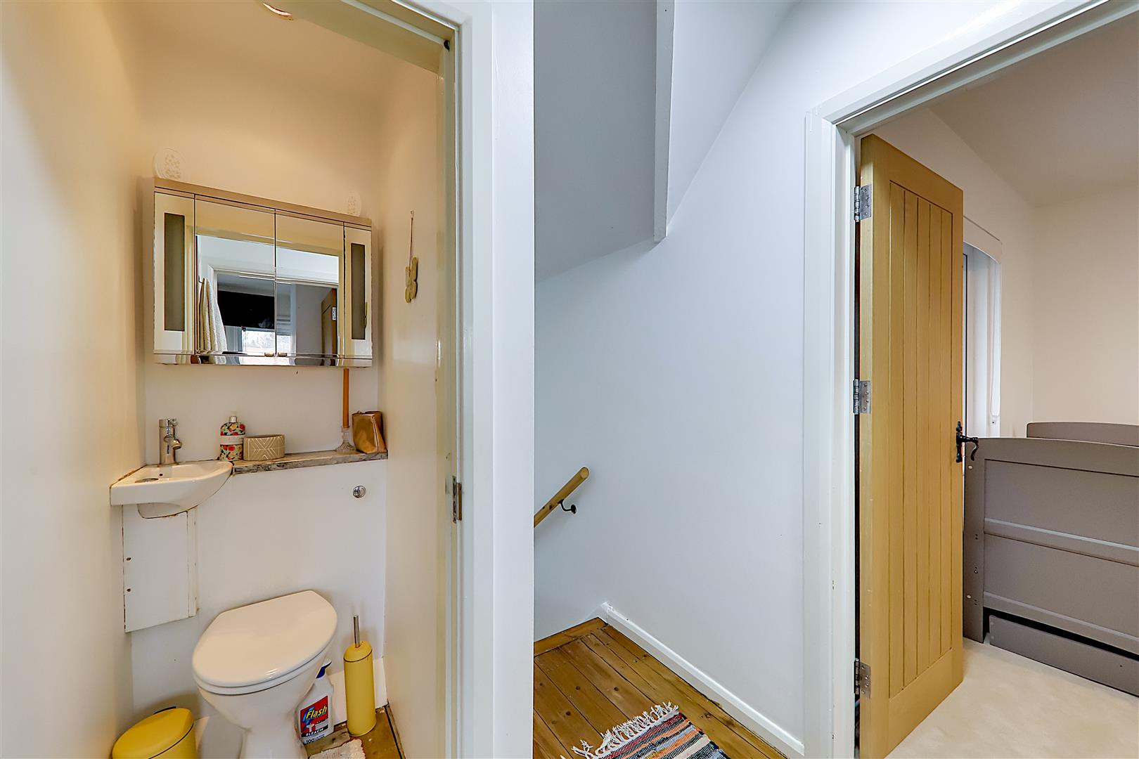 Wooden flooring, low flush WC, contemporary hand wash basin with mixer tap, wall mounted vanity unit with mirrored front, extractor fan, skimmed ceiling with spotlight.